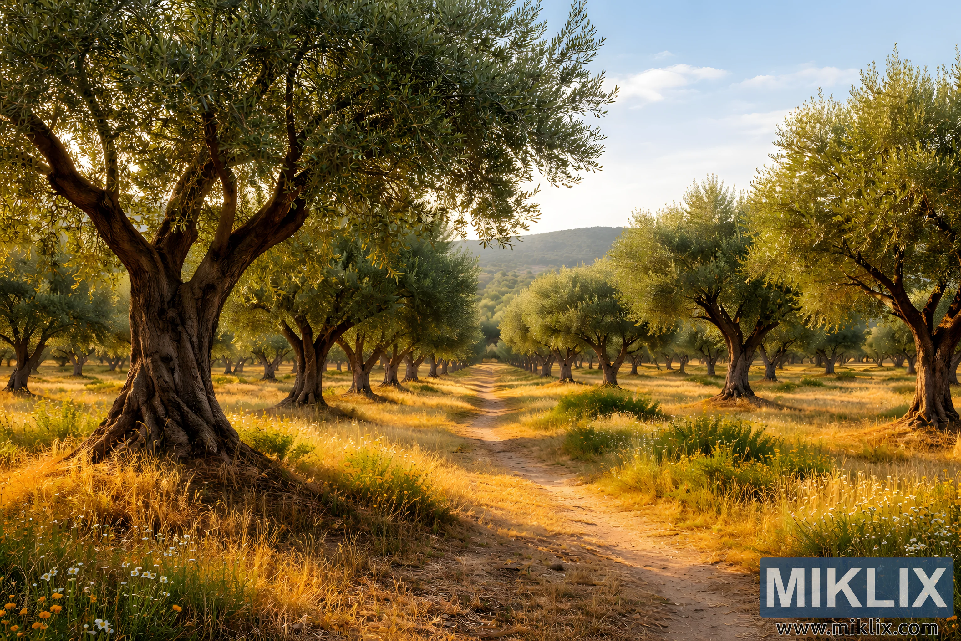 A tranquil olive plantation bathed in warm golden light, showing thriving olive trees, a central dirt path, and distant hills under a clear sky, symbolizing sustainable agriculture and Mediterranean landscapes.