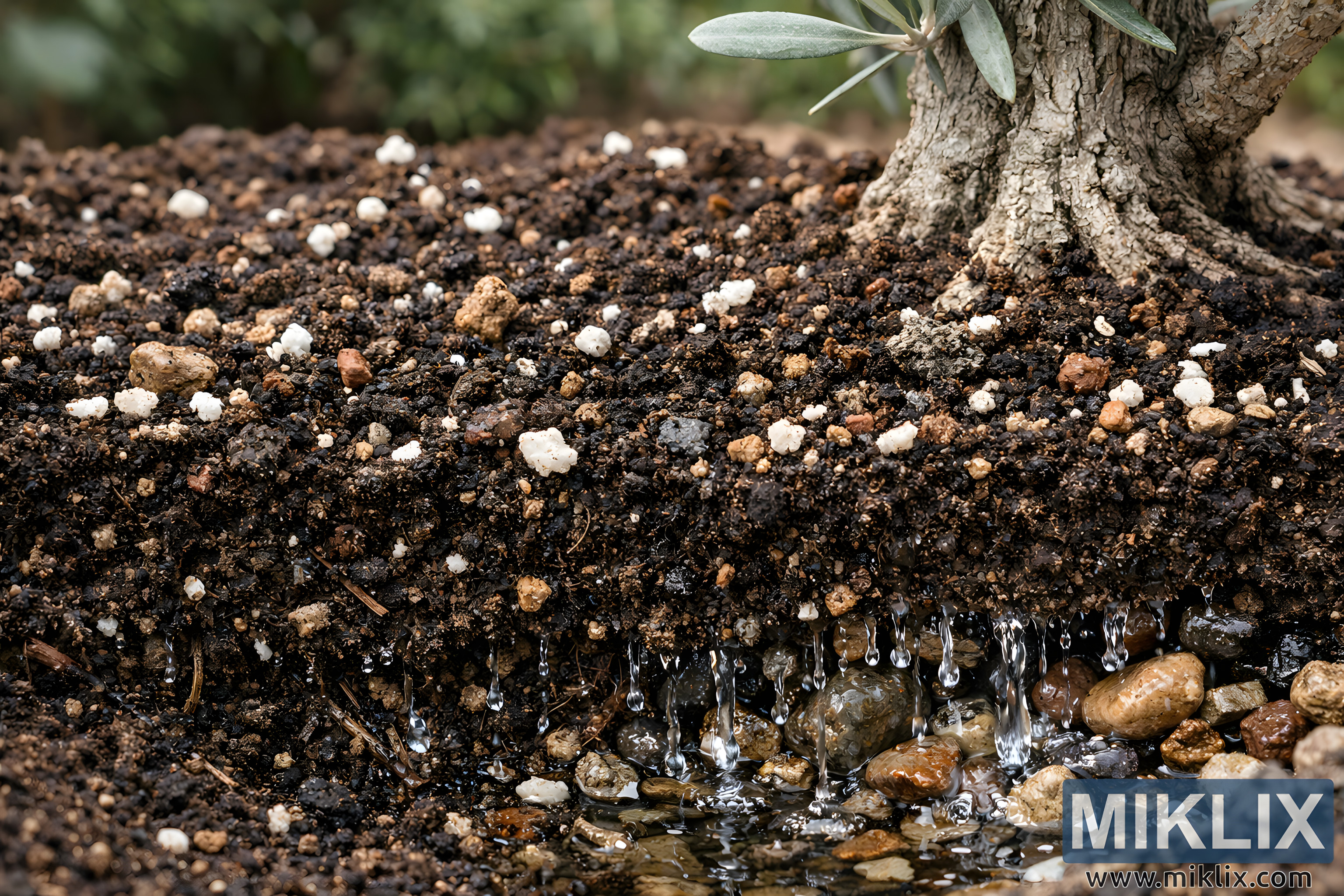The image presents a high-resolution, landscape-oriented close-up of an ideal soil mix designed specifically for olive trees, emphasizing texture, structure, and effective drainage. In the foreground, a cross-section of the soil reveals a carefully balanced composition: dark, crumbly organic matter forms the base, interspersed with coarse mineral elements that prevent compaction. Visible throughout the mix are small white granules of perlite, adding lightness and air pockets, alongside irregular pieces of crushed lava rock and rounded pebbles in shades of tan, rust, and gray. These aggregates vary in size and shape, creating a heterogeneous matrix that allows water to move freely while still retaining enough moisture for healthy root growth. At the lower edge of the soil profile, water can be seen actively draining downward, forming clear droplets that fall between the stones and collect briefly before passing out of view. This visual cue reinforces the concept of excellent drainage, a critical requirement for olive trees that are sensitive to waterlogged roots. The soil surface above appears loose and well-aerated rather than dense or muddy, suggesting proper porosity and oxygen availability. On the right side of the frame, the textured trunk of an olive tree emerges from the soil. Its bark is rough and fissured, with a silvery-gray tone characteristic of mature olive wood. A few slender branches extend upward and outward, bearing narrow, elongated leaves with muted green upper surfaces and paler, silvery undersides. These leaves catch soft, natural light, subtly reflecting it and adding a gentle contrast to the darker soil tones. The background is softly blurred, showing hints of surrounding garden vegetation without distracting detail, which draws the viewer’s attention back to the soil composition and the base of the tree. The lighting is natural and even, highlighting the granular details and moisture without harsh shadows. Overall, the image functions both as an educational illustration and a realistic garden scene, clearly communicating how a well-draining, mineral-rich soil supports olive tree health by combining organic matter with coarse amendments that facilitate airflow and water movement.