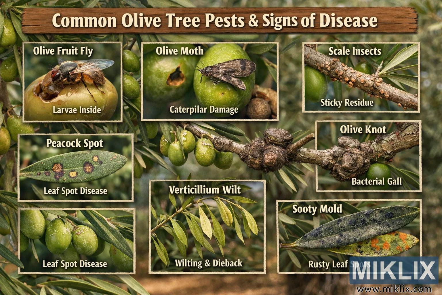 High-resolution educational infographic illustrating common olive tree pests and diseases with labeled photographic examples, useful for growers, gardeners, and plant health education.