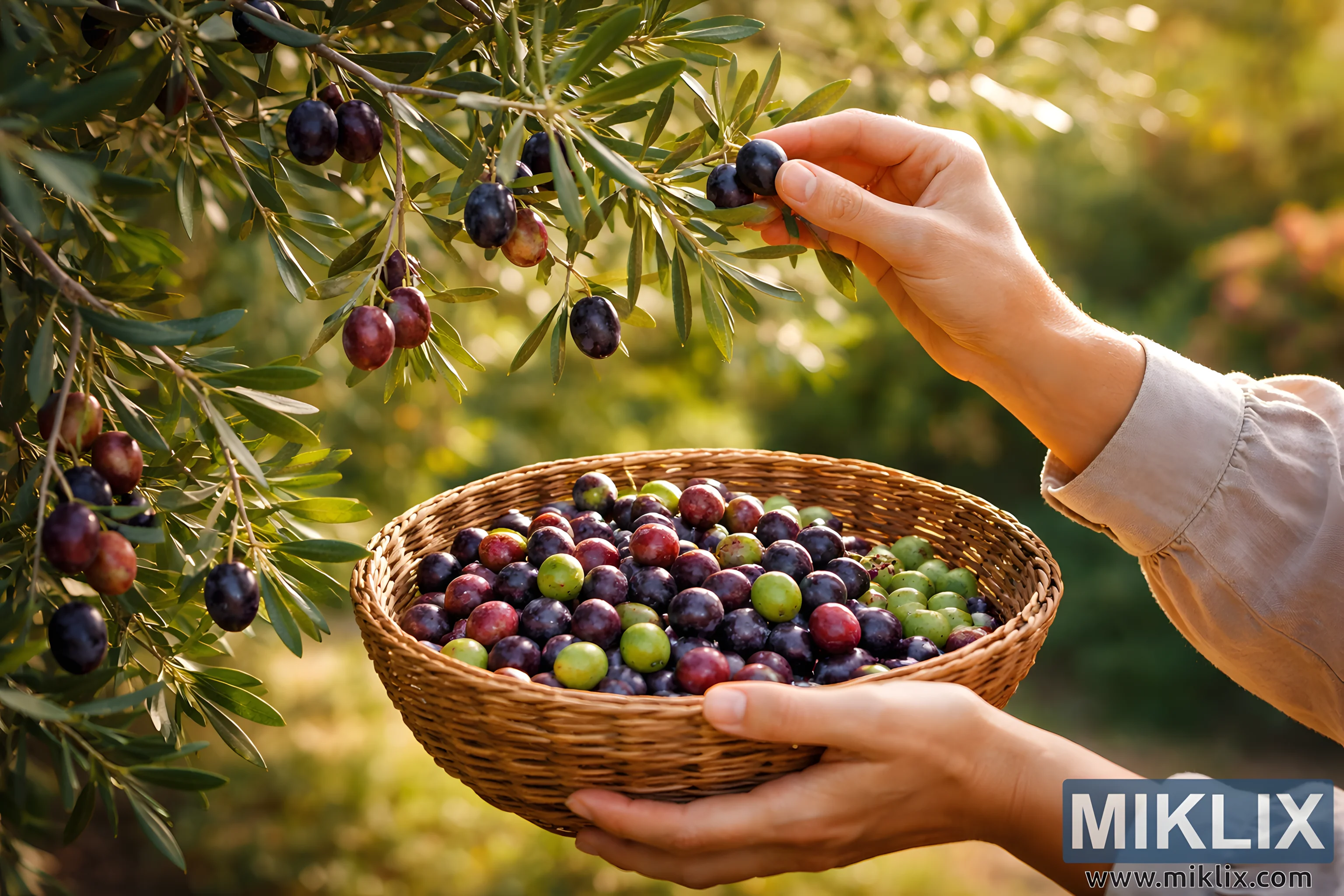 The image depicts a serene moment of harvesting ripe olives from a home garden tree, captured in warm, natural light that suggests late afternoon or early evening. In the foreground, two human hands are gently engaged in the act of picking olives. One hand reaches toward a slender olive branch, delicately holding a single dark purple olive between the fingertips, while the other supports a shallow, round woven basket. The basket is already filled with freshly harvested olives, displaying a rich variety of colors that range from bright green to reddish-purple and deep violet, indicating different stages of ripeness. The olives have a smooth, slightly glossy surface that reflects the sunlight softly. The olive tree’s branches extend diagonally across the frame, adorned with narrow, silvery-green leaves that catch the light and create subtle highlights and shadows. The leaves appear healthy and dense, framing the fruit clusters naturally and adding texture to the composition. Sunlight filters through the foliage, producing a gentle bokeh effect in the background, where the garden fades into soft greens and golden tones. This blurred background enhances the sense of depth and draws attention to the hands, the olives, and the basket. The overall mood of the image is calm, intimate, and authentic, evoking themes of home gardening, seasonal harvest, and a close connection to nature. The careful posture of the hands suggests mindfulness and appreciation for the process, rather than haste. The woven basket, rustic and practical, reinforces the idea of traditional, small-scale food production. The scene feels unposed and natural, as if captured during a quiet moment of daily life, celebrating the simplicity and satisfaction of gathering food directly from one’s own garden. The combination of warm light, natural textures, and rich colors creates a visually pleasing and emotionally comforting image that highlights the beauty of a humble agricultural ritual.
