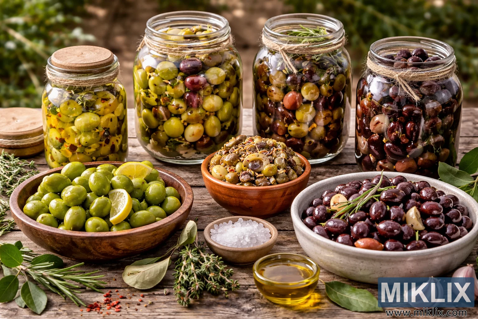 The image presents a richly detailed, landscape-oriented still life of home-cured olives displayed in various stages of preparation, arranged on a weathered wooden table outdoors. Soft, natural daylight illuminates the scene, highlighting the textures and subtle color variations of the olives and their accompaniments. In the background, slightly out of focus, are hints of greenery that suggest a garden or olive grove, reinforcing a sense of traditional, homemade food culture. Across the back of the table stand several clear glass jars of different sizes, each filled with olives prepared in distinct ways. One jar contains bright green olives marinated with lemon slices and herbs, their skins glossy and taut. Another jar holds a mix of green and blush-toned olives with visible chili flakes, garlic pieces, and herbs suspended in oil or brine. A third jar features darker olives, deep purple to nearly black, suggesting a Kalamata-style cure, with herbs tucked beneath the lid. Twine is wrapped around the necks of some jars, and simple wooden or metal lids add to the rustic aesthetic. In the foreground, shallow bowls made of wood and ceramic display olives ready for serving. A wooden bowl on the left contains plump green olives paired with fresh lemon wedges, their pale yellow flesh contrasting with the vivid green skins. A smaller bowl near the center holds chopped or cracked olives mixed with spices, seeds, and herbs, indicating an intermediate or seasoned stage of curing. On the right, a larger ceramic bowl presents glossy dark olives accented with slivers of garlic and sprigs of rosemary. Scattered around the bowls are coarse salt crystals, red chili flakes, bay leaves, thyme, rosemary, garlic cloves, and a small glass dish of golden olive oil that catches the light. The overall composition emphasizes abundance, craftsmanship, and variety, showcasing the progression from raw or lightly cured olives to fully seasoned, table-ready preparations. The image conveys warmth, tradition, and patience, evoking the sensory experience of Mediterranean-style home curing, where time, simple ingredients, and careful handling transform fresh olives into complex, flavorful preserves.