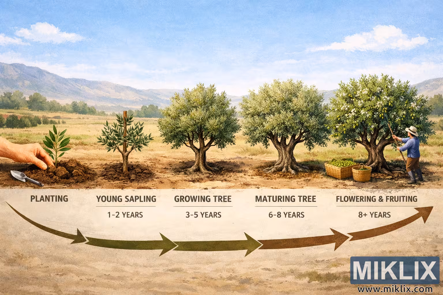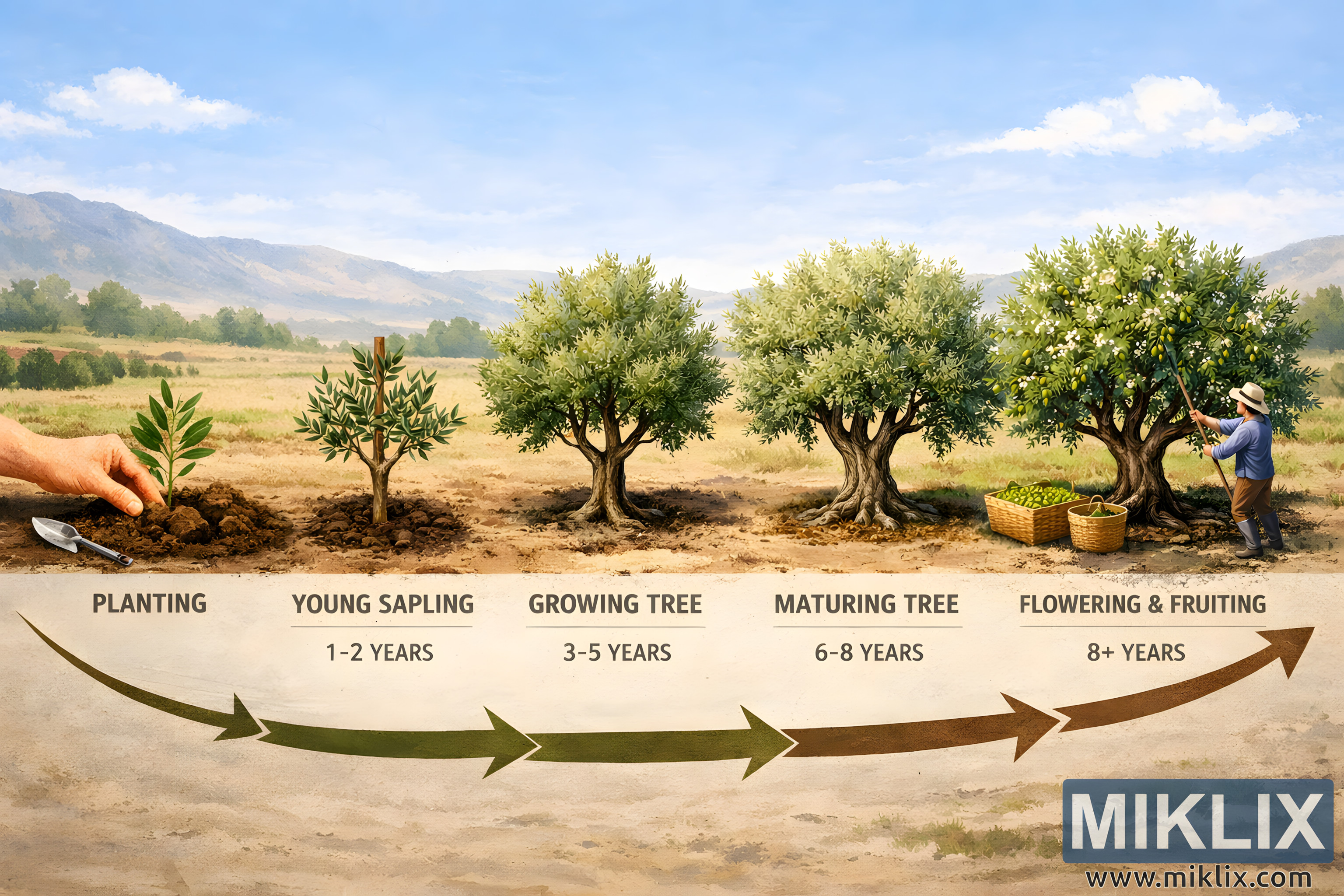 Educational landscape infographic illustrating the timeline of olive tree growth stages, from planting and sapling development to mature trees and olive harvest.