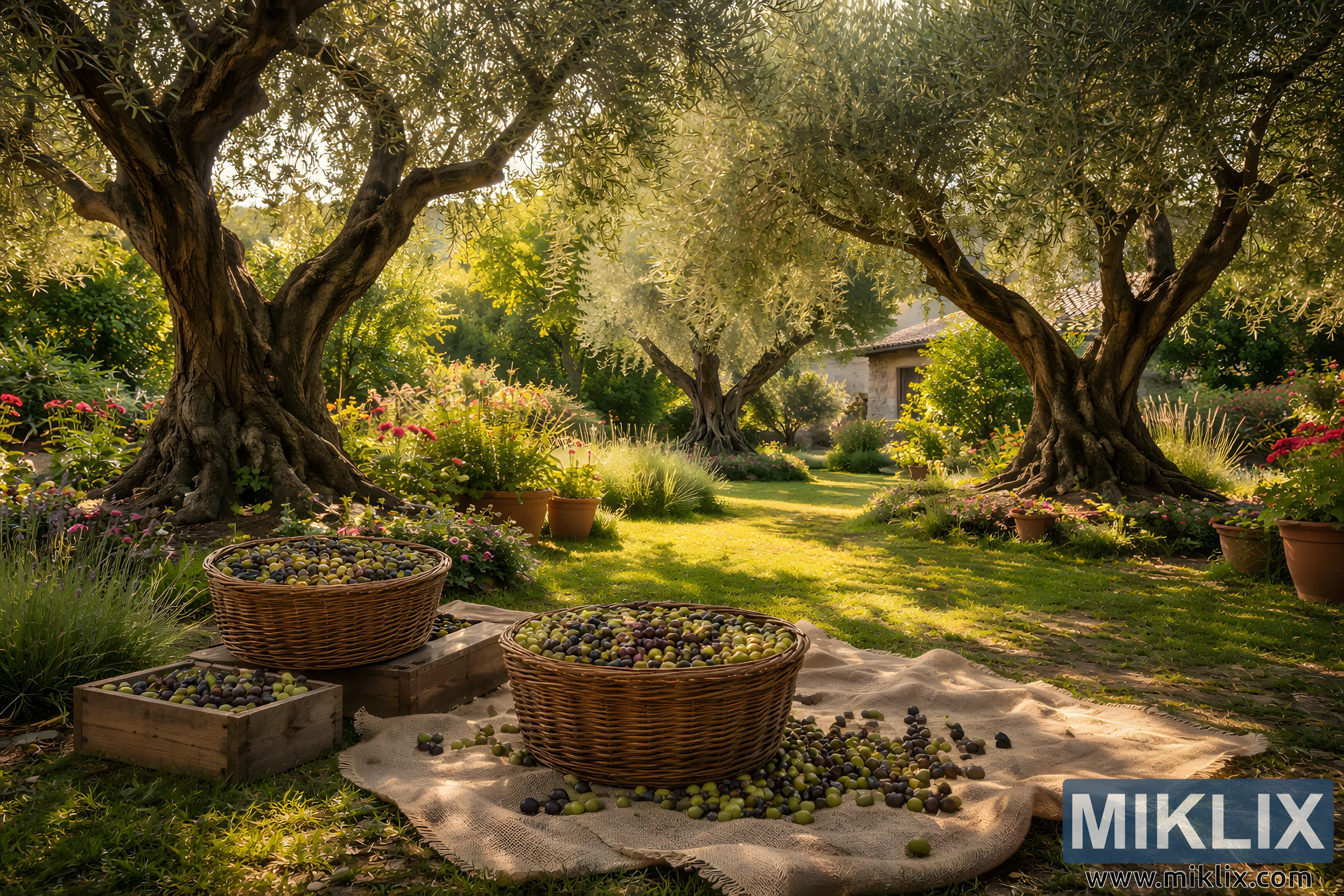 The image depicts a tranquil home garden scene centered around several mature olive trees with thick, gnarled trunks and wide, gracefully spreading canopies. Their silvery-green leaves filter warm sunlight, creating a dappled pattern of light and shadow across the neatly maintained grass below. The trees are spaced generously, suggesting a private Mediterranean-style garden rather than a commercial grove, and their age is evident in the textured bark and twisted forms that give the setting a timeless, cultivated character. In the foreground, freshly harvested olives are displayed in rustic wicker baskets and shallow wooden crates, resting on natural fabric laid directly on the lawn. The olives vary in color from green to deep purple, indicating different stages of ripeness and adding visual richness to the scene. Some olives have spilled casually onto the cloth, reinforcing the sense of a recent, hands-on harvest. Surrounding the olive trees are flowering plants, ornamental grasses, and terracotta pots that soften the space and frame the harvest area with subtle color and texture. A small stone or stucco building is partially visible in the background, suggesting a home or garden outbuilding and reinforcing the domestic, lived-in quality of the landscape. The overall atmosphere is calm and inviting, evoking late afternoon or early evening, when the light is warm and golden. The composition balances natural elements with human activity, highlighting the connection between the cultivated garden, traditional harvesting practices, and the enduring presence of olive trees as symbols of longevity, nourishment, and rural Mediterranean life.