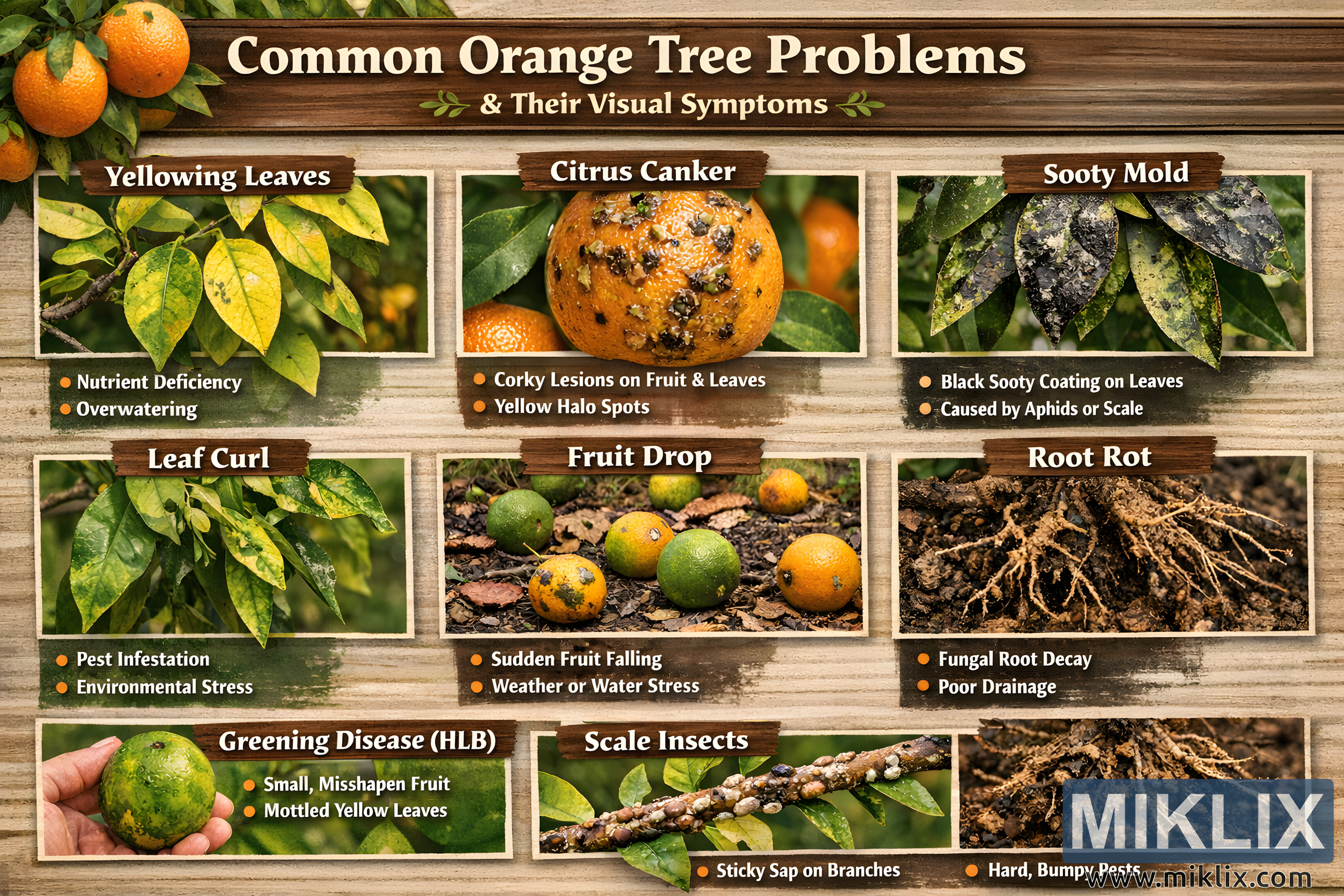 Educational landscape infographic illustrating common orange tree problems and their visual symptoms, including leaf discoloration, fruit damage, fungal diseases, and insect infestations.