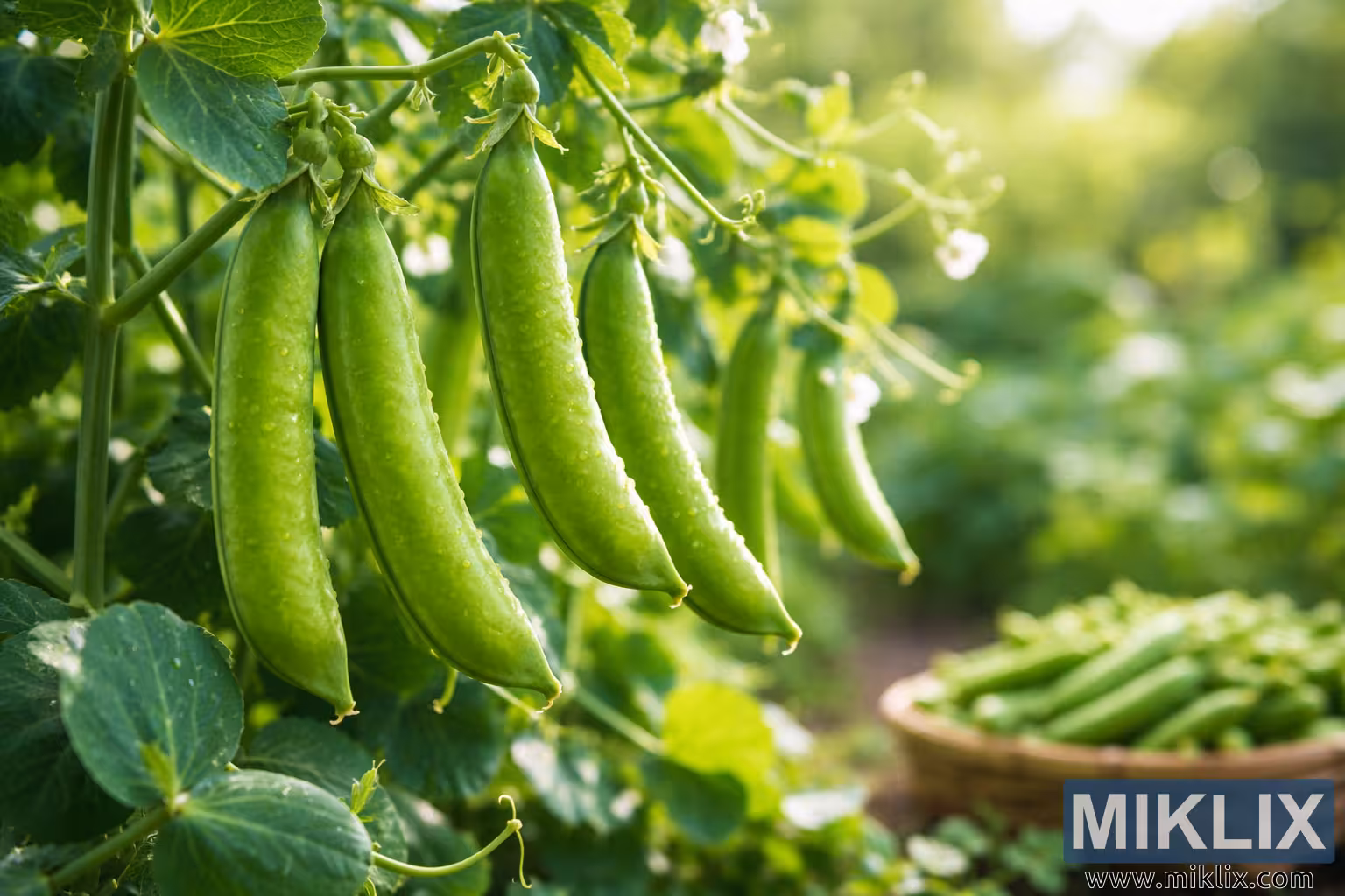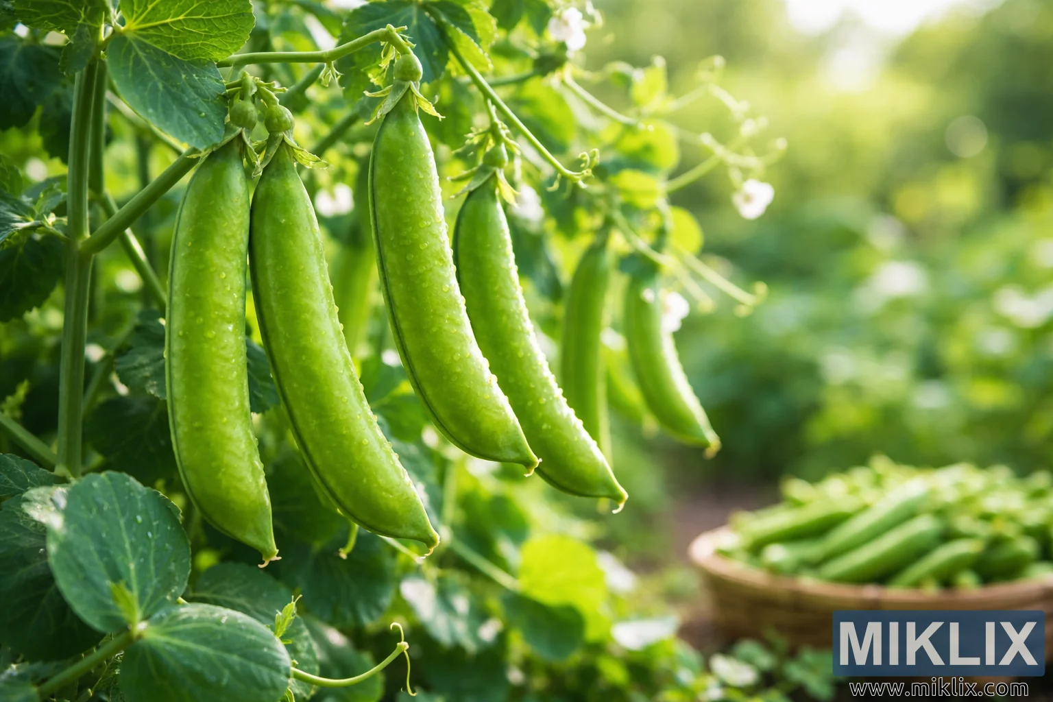 The image presents a lush, sunlit garden scene focused on fresh sugar snap peas hanging from healthy green vines at the peak of ripeness. Several elongated pea pods dangle in the foreground, their surfaces smooth, taut, and gently curved, with tiny beads of moisture clinging to the skins as if left behind by early morning dew. The peas glow a vibrant, natural green, subtly varied in tone where sunlight filters through surrounding leaves, highlighting their crisp texture and fullness. Slender stems and curling tendrils frame the pods, creating a sense of delicate structure and growth, while broad, veined leaves overlap in layers that suggest a thriving, well-tended plant. Soft white pea blossoms appear sporadically among the foliage, adding small points of contrast and hinting at the plant’s ongoing cycle of flowering and fruiting. The background recedes into a gentle blur, producing a shallow depth of field that keeps attention on the peas while still conveying the richness of the garden environment. In this softened distance, a rustic basket filled with freshly harvested sugar snap peas rests on the ground, its woven texture and warm, earthy tones complementing the greens of the plants. The basket reinforces the theme of harvest and abundance, suggesting that the peas in the foreground are moments away from being picked. Light plays a central role in the composition, entering from the side and behind the plants to create a warm, golden glow that enhances the natural colors without overpowering them. Highlights shimmer subtly on the pea pods, while shadows beneath the leaves add depth and dimension. The overall atmosphere is calm, fresh, and inviting, evoking the quiet satisfaction of a productive garden and the promise of crisp, sweet flavor. The image feels authentic and seasonal, capturing the precise moment when sugar snap peas are at their best—plump, tender, and ready for harvest—while celebrating the beauty of simple, homegrown produce in a natural outdoor setting.