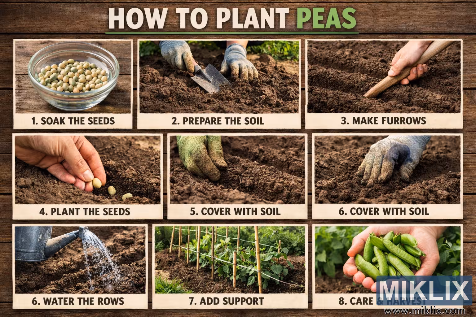 Landscape instructional image showing a step-by-step visual guide on how to plant peas, including seed soaking, soil preparation, planting, watering, support, and harvesting.