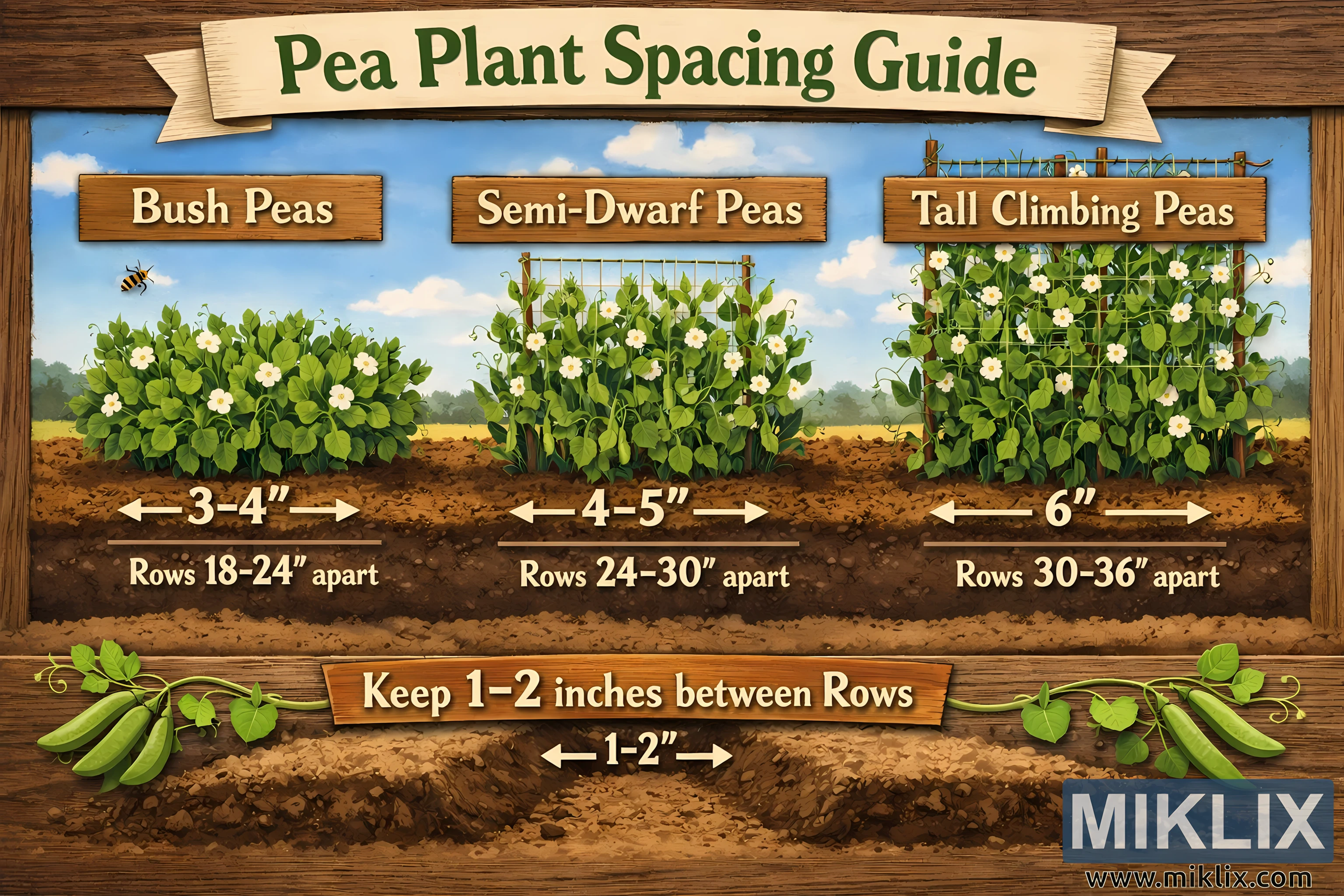 At the bottom of the image, a wooden sign-style banner runs across the width of the diagram. It includes a general planting reminder that reads "Keep 1–2 inches between rows," accompanied by a small arrow labeled "1–2." Decorative pea pods and vines frame this lower section, reinforcing the gardening theme. Overall, the image combines clear measurements, visual plant differences, and an approachable illustrated style to help gardeners understand how to space pea plants correctly for healthy growth.
