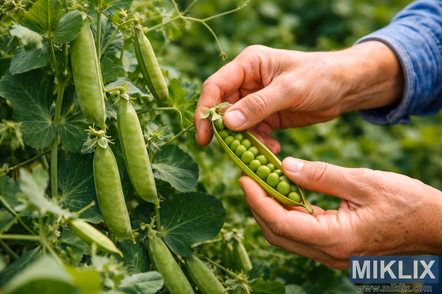 Landscape photo of hands gently harvesting ripe peas from garden vines, showing proper technique, fresh green pods, and healthy foliage in natural daylight.