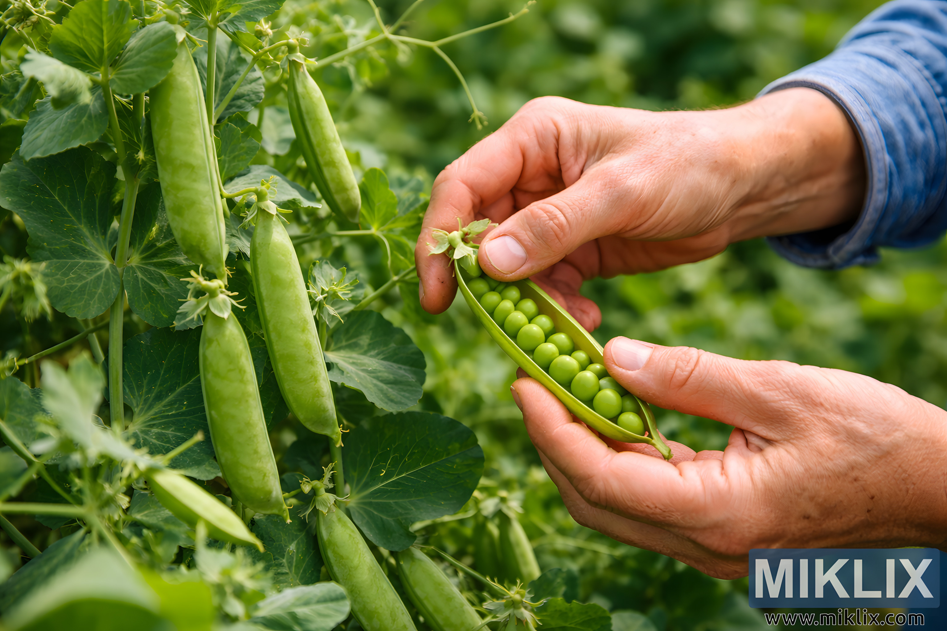 The image presents a detailed, landscape-oriented photograph focused on the careful harvesting of ripe peas directly from healthy garden vines. At the center of the composition are two human hands, positioned with deliberate precision to demonstrate proper harvesting technique. One hand gently supports a freshly opened pea pod, revealing a neat row of plump, round peas that are a vibrant, uniform green, indicating peak ripeness. The other hand steadies the vine near the stem, suggesting an intent to detach the pod without damaging the plant. The hands appear slightly weathered, with visible texture, natural creases, and faint traces of soil, conveying the authenticity of hands-on gardening work. A blue denim sleeve partially enters the frame, reinforcing the practical, outdoors setting and lending a rustic, agricultural character to the scene. Surrounding the hands, lush pea vines fill the background with overlapping leaves, tendrils, blossoms, and additional pods at various stages of maturity. The foliage is dense and healthy, with soft highlights and shadows that suggest natural daylight, likely from an overcast or gently sunlit sky. The shallow depth of field keeps the hands and opened pod in sharp focus while the surrounding greenery softly blurs, drawing attention to the harvesting action and the peas themselves. Color tones are natural and balanced, dominated by fresh greens contrasted subtly by the warm, earthy tones of skin and fabric. The overall mood of the image is calm, instructional, and grounded in sustainable food practices, emphasizing patience, care, and respect for the growing plant. The photograph visually communicates both abundance and restraint, illustrating how food is gathered thoughtfully rather than forcefully. It evokes themes of home gardening, small-scale agriculture, seasonal harvest, and the tactile satisfaction of growing and picking one’s own produce. The scene feels intimate and educational, suitable for illustrating gardening guides, agricultural manuals, farm-to-table concepts, or content focused on self-sufficiency and responsible cultivation.