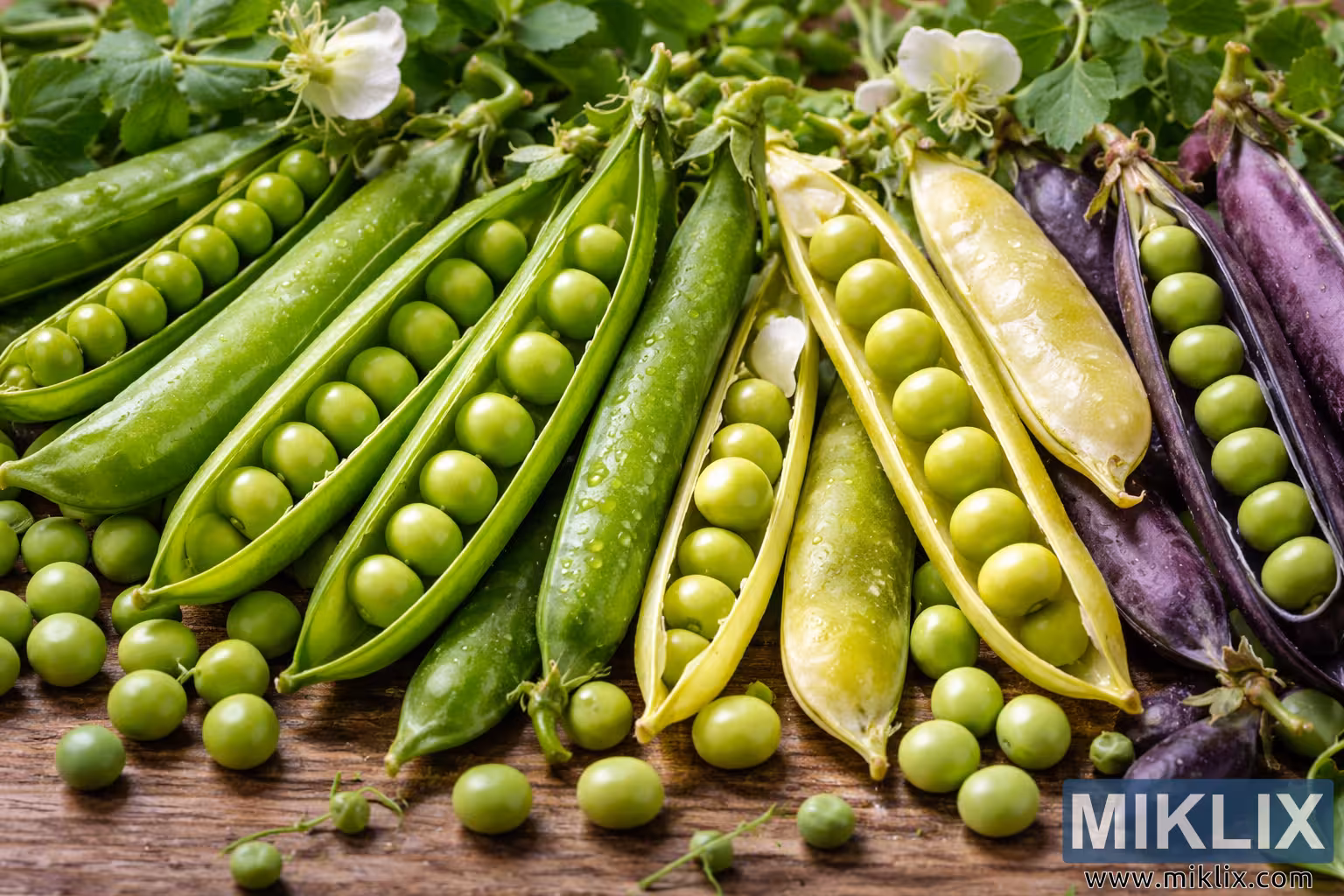 Detailed close-up photograph of freshly harvested pea varieties, including green and purple pods, showcasing texture, color, and peak ripeness on a rustic wooden background.