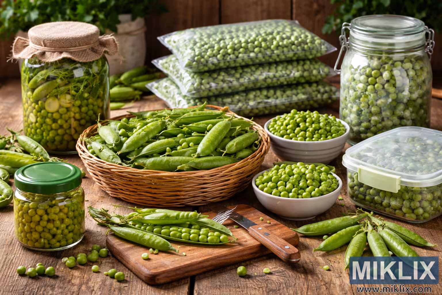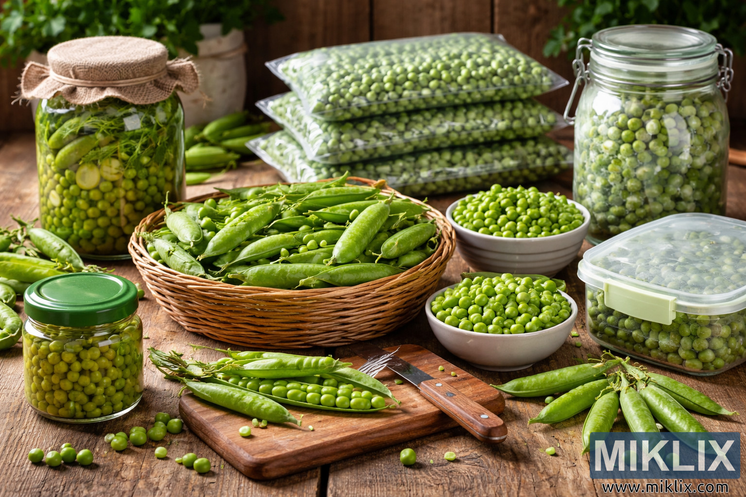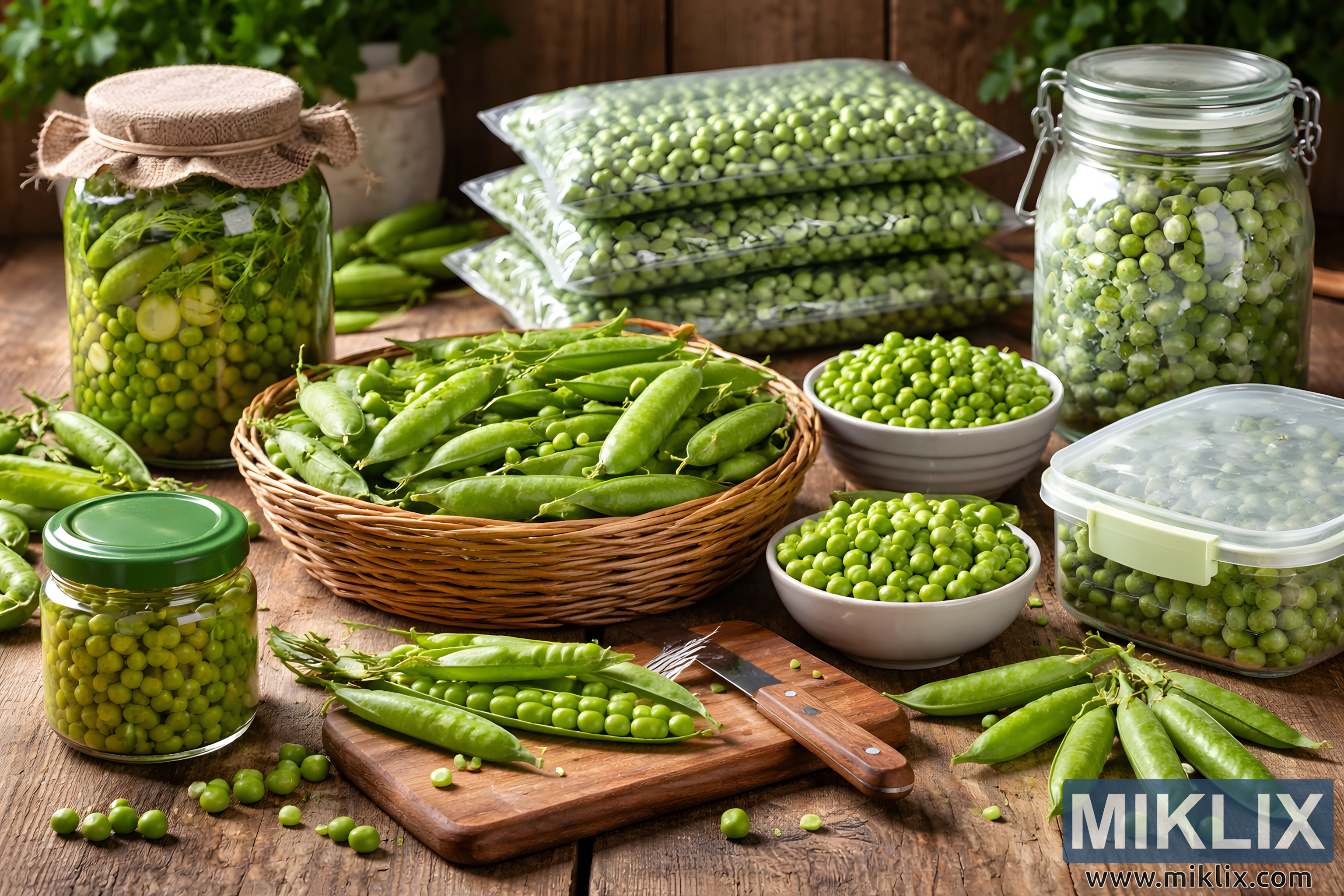 High-quality photograph illustrating different methods of storing and preserving fresh peas, including canning, freezing, vacuum sealing, and fresh preparation, arranged on a rustic kitchen table.