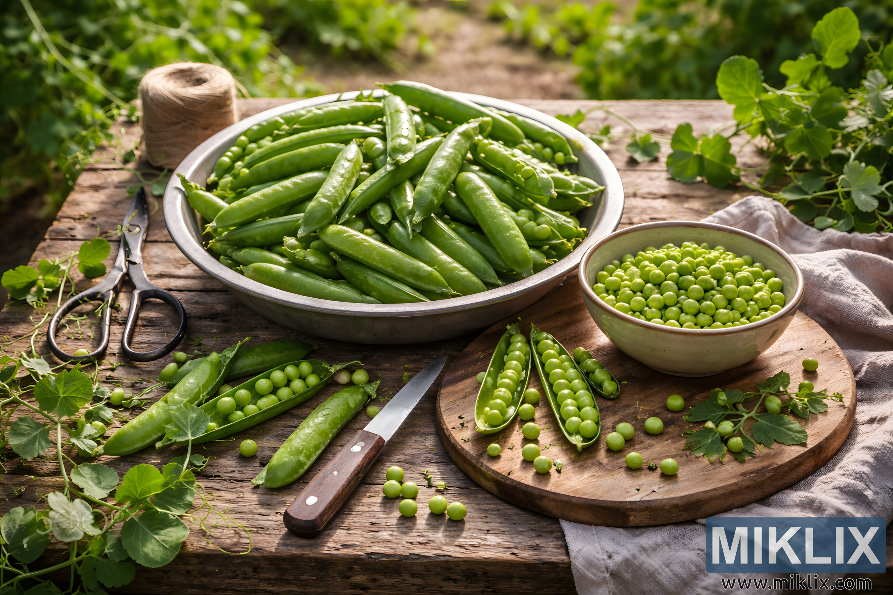 The image presents a richly detailed, landscape-oriented still life centered on freshly harvested peas being prepared for a meal, capturing the quiet satisfaction and abundance that comes from home gardening. At the heart of the scene sits a wide, shallow metal bowl brimming with plump, vibrant green pea pods. Many of the pods are intact, their smooth skins slightly glossy in the soft natural light, while a few are split open to reveal tightly packed rows of round, bright peas inside. The peas appear crisp and freshly picked, with subtle variations in size and color that emphasize their natural, unprocessed state. The bowl rests on a weathered wooden table whose surface shows visible grain, cracks, and knots, adding warmth and a sense of rustic authenticity. In front of the bowl, a round wooden cutting board holds several opened pea pods arranged casually, alongside loose peas that have spilled out and rolled across the board and table. A small kitchen knife with a wooden handle lies nearby, suggesting that shelling is actively underway. To the left, a pair of dark metal garden scissors and a spool of natural twine hint at the earlier harvesting process, connecting the preparation scene back to the garden. On the right side of the composition, a ceramic bowl filled with shelled peas showcases their abundance and readiness for cooking. A soft, neutral-colored linen cloth is draped partially beneath the bowl and cutting board, adding texture and a homely kitchen atmosphere. Fresh green pea vines and leaves frame the edges of the table and extend into the softly blurred background, where rows of green plants suggest an outdoor garden setting bathed in daylight. The lighting is gentle and natural, likely from the sun, casting soft shadows and enhancing the vivid green hues without harsh contrast. Overall, the image conveys a calm, rewarding moment of transition from garden to kitchen, celebrating the tactile, visual, and emotional pleasure of growing food and preparing it by hand.