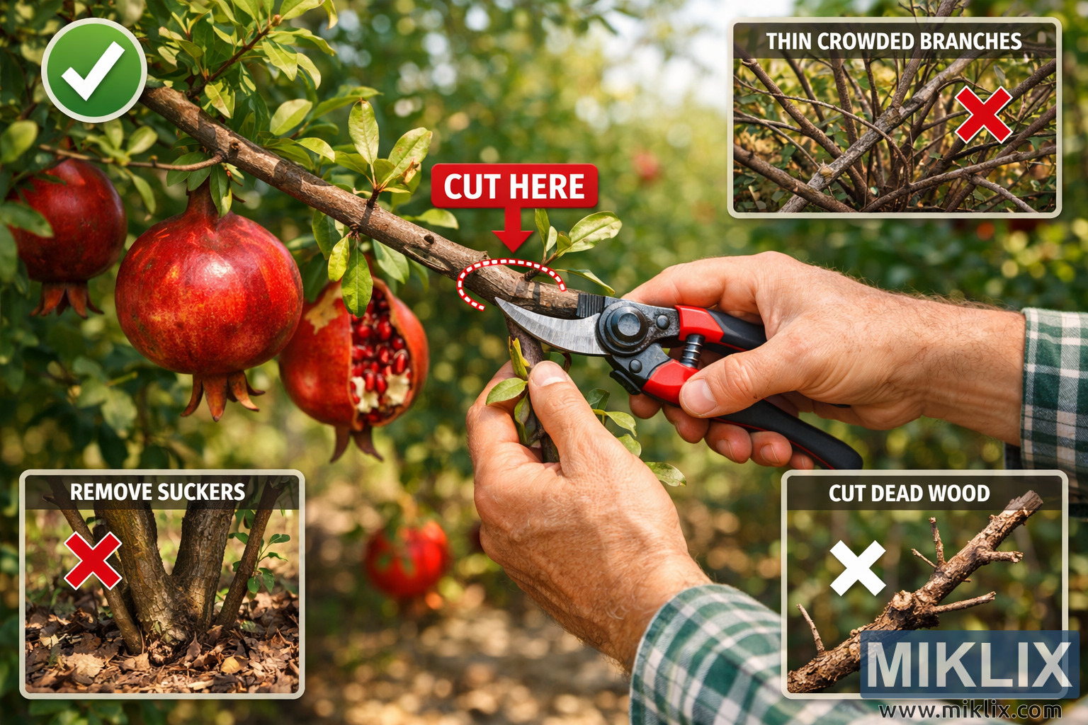 The image is a high-resolution, landscape-oriented educational photograph illustrating proper pruning techniques for pomegranate trees in a sunlit orchard. At the center of the composition, a pair of adult hands holds professional red-and-black pruning shears, positioned mid-action as they make a clean, angled cut on a healthy pomegranate branch. A bold red label reading "CUT HERE" with a downward arrow and dotted outline precisely marks the correct pruning location just above a node, emphasizing accuracy and technique. The main branch extends diagonally across the frame, carrying glossy green leaves and several mature pomegranates with deep red skins; one fruit is split open, revealing vibrant ruby seeds that add visual richness and reinforce the agricultural context. The background is softly blurred with rows of trees and dappled sunlight, creating a shallow depth of field that keeps focus on the pruning action while conveying a productive orchard environment. Surrounding the central image are three inset panels designed as instructional callouts. The top-right inset shows a dense cluster of tangled branches labeled "THIN CROWDED BRANCHES," marked with a red X to indicate improper structure that should be removed for better airflow and light penetration. The bottom-left inset, titled "REMOVE SUCKERS," depicts multiple shoots emerging from the base of a trunk, again crossed out to show that these growths should be cut away to direct energy to fruiting branches. The bottom-right inset, labeled "CUT DEAD WOOD," displays a dry, brittle branch fragment, reinforcing the importance of removing non-productive or diseased material. A green check mark icon near the main branch contrasts with the red X symbols in the insets, clearly distinguishing correct practices from mistakes. The overall visual style blends realism with instructional graphics, making the image suitable for agricultural guides, gardening manuals, educational websites, or training materials focused on fruit tree maintenance. Colors are natural and vivid, lighting is warm and even, and the composition balances clarity with aesthetic appeal, ensuring that viewers can easily understand and apply the pruning principles being demonstrated.