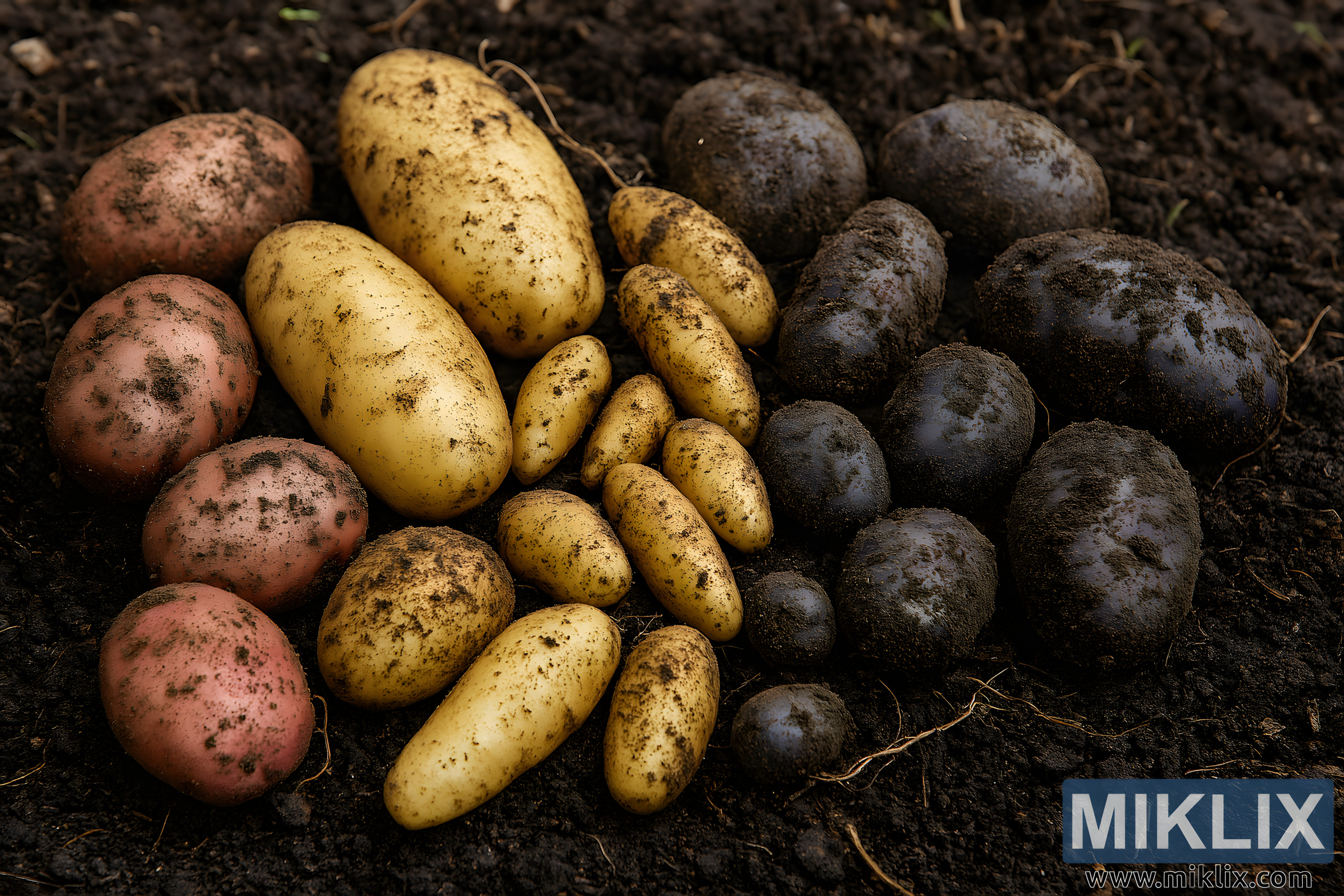 A close-up landscape photo of various freshly harvested potato varieties with soil still attached, showcasing natural textures and earthy tones.