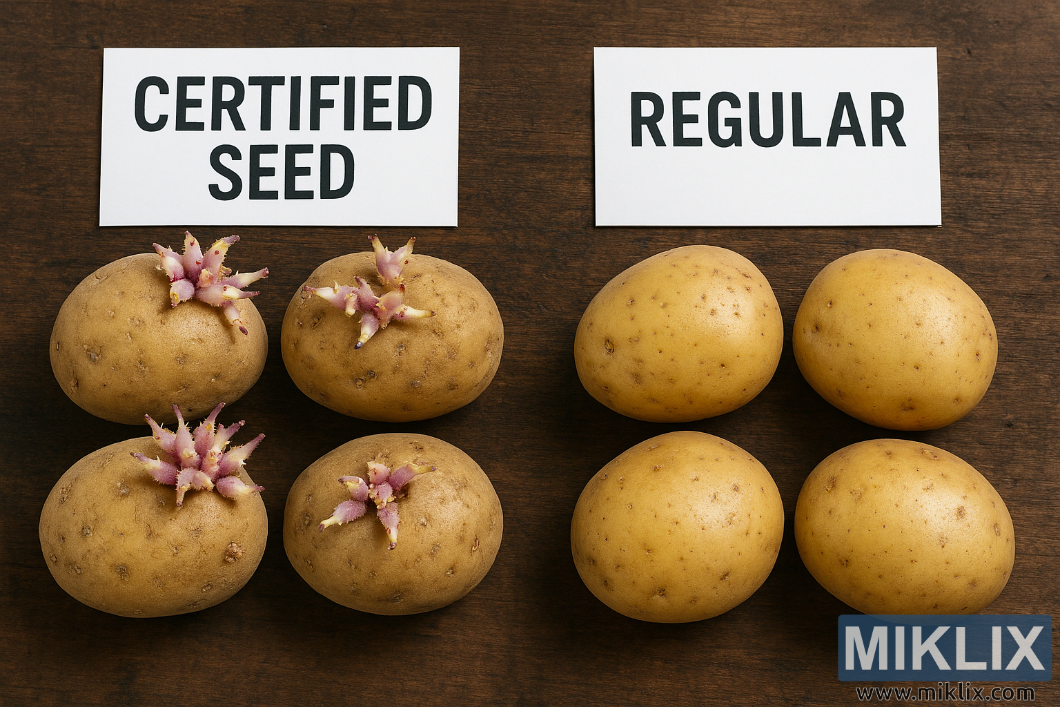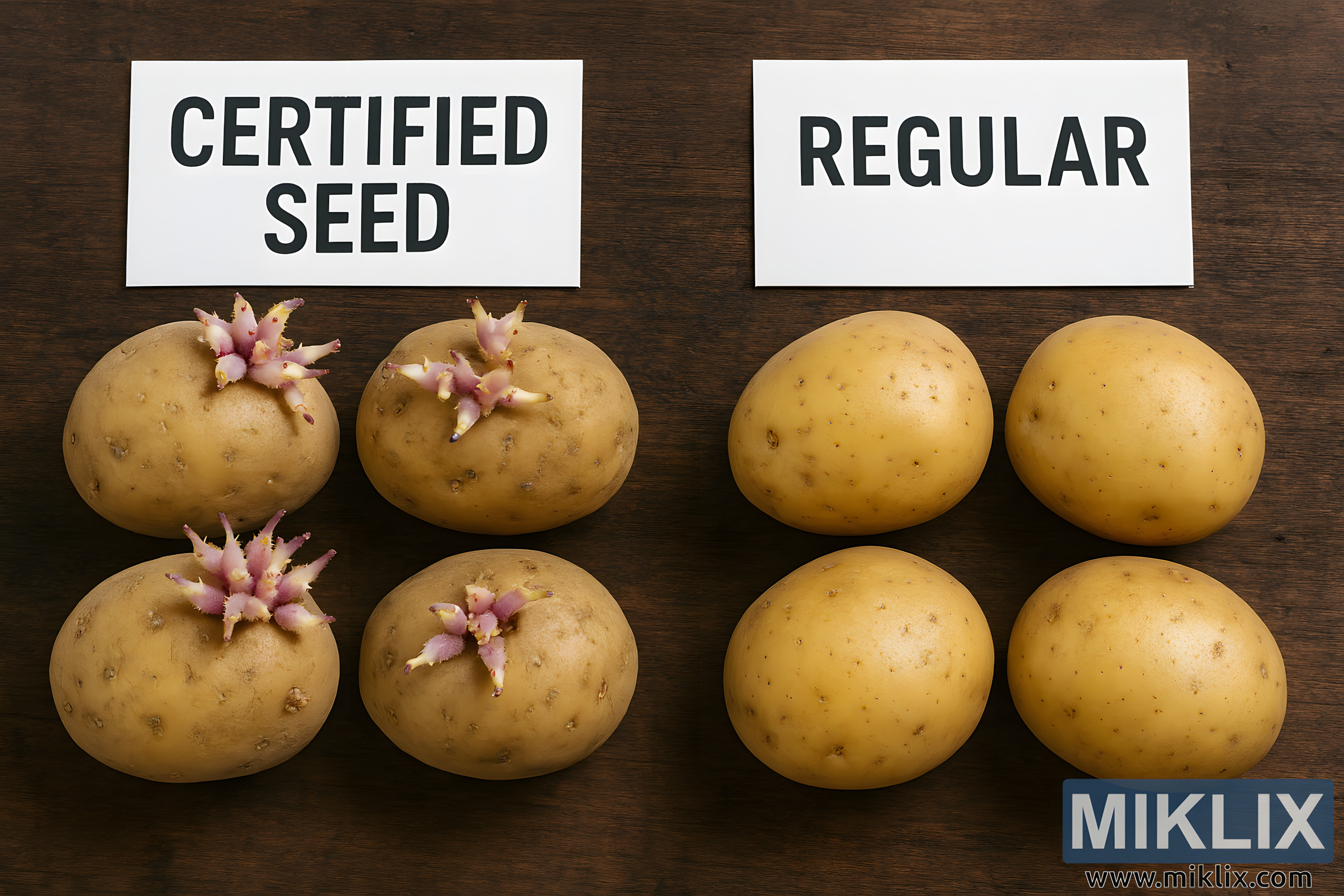 High-resolution image comparing certified seed potatoes with sprouting eyes to regular grocery store potatoes, highlighting differences in texture, sprouting, and labeling.