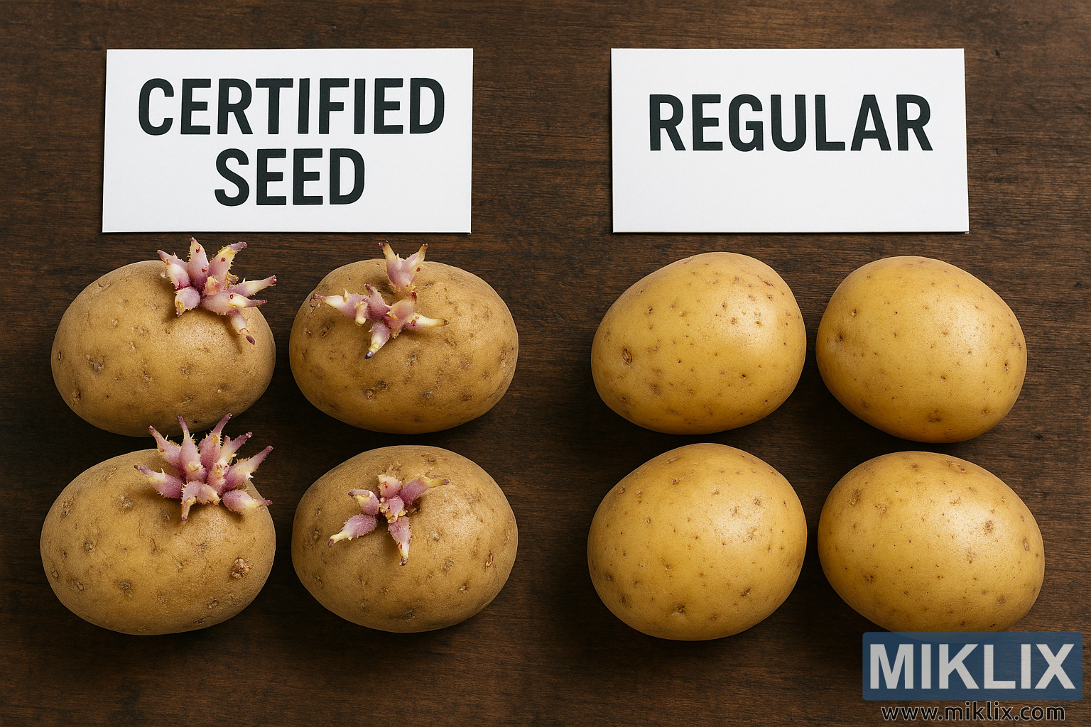 Overall, the photograph serves as an educational and illustrative comparison, highlighting the physical and functional differences between certified seed potatoes prepared for planting and regular potatoes intended for consumption. It is ideal for use in agricultural guides, gardening catalogs, educational materials, or promotional content related to seed quality and potato cultivation.