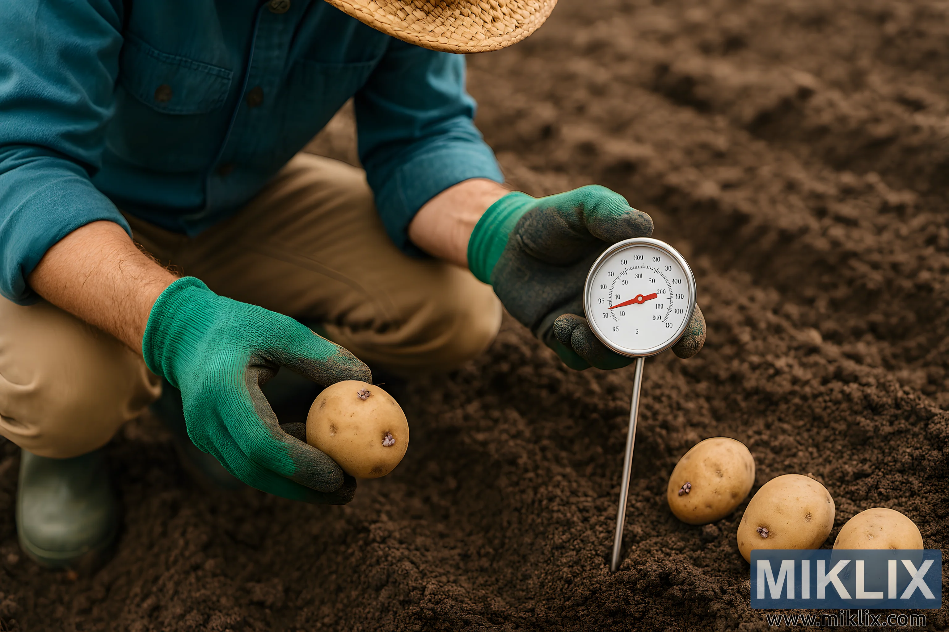 A gardener checks soil temperature with a thermometer before planting seed potatoes in freshly tilled soil. The image captures realistic textures, tools, and planting preparation in a natural outdoor setting.