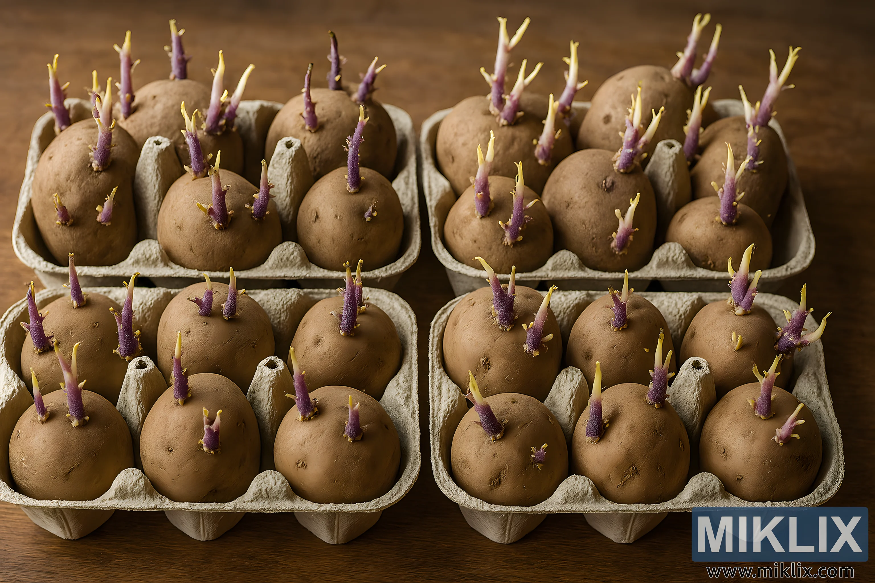 This high-resolution landscape photograph captures a rustic gardening scene featuring seed potatoes undergoing the chitting process. The potatoes are nestled in four recycled beige egg cartons, each with twelve compartments, arranged neatly on a warm-toned wooden surface. The cartons cradle the potatoes securely, their molded pulp texture contrasting subtly with the smooth, slightly rough skin of the tubers.