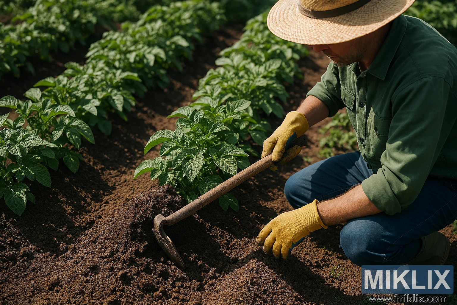 A gardener hilling soil around potato plants in a well-maintained vegetable garden, protecting tubers with rich earth under natural daylight.