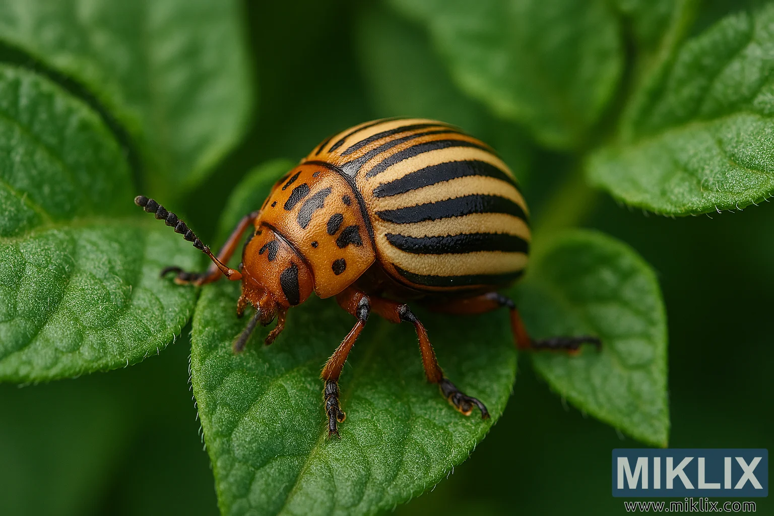 The composition emphasizes the beetle’s ecological role and visual distinctiveness, making it ideal for educational, agricultural, or entomological use. The image conveys both the beauty and the pest status of the Colorado potato beetle, a notorious defoliator of solanaceous crops.