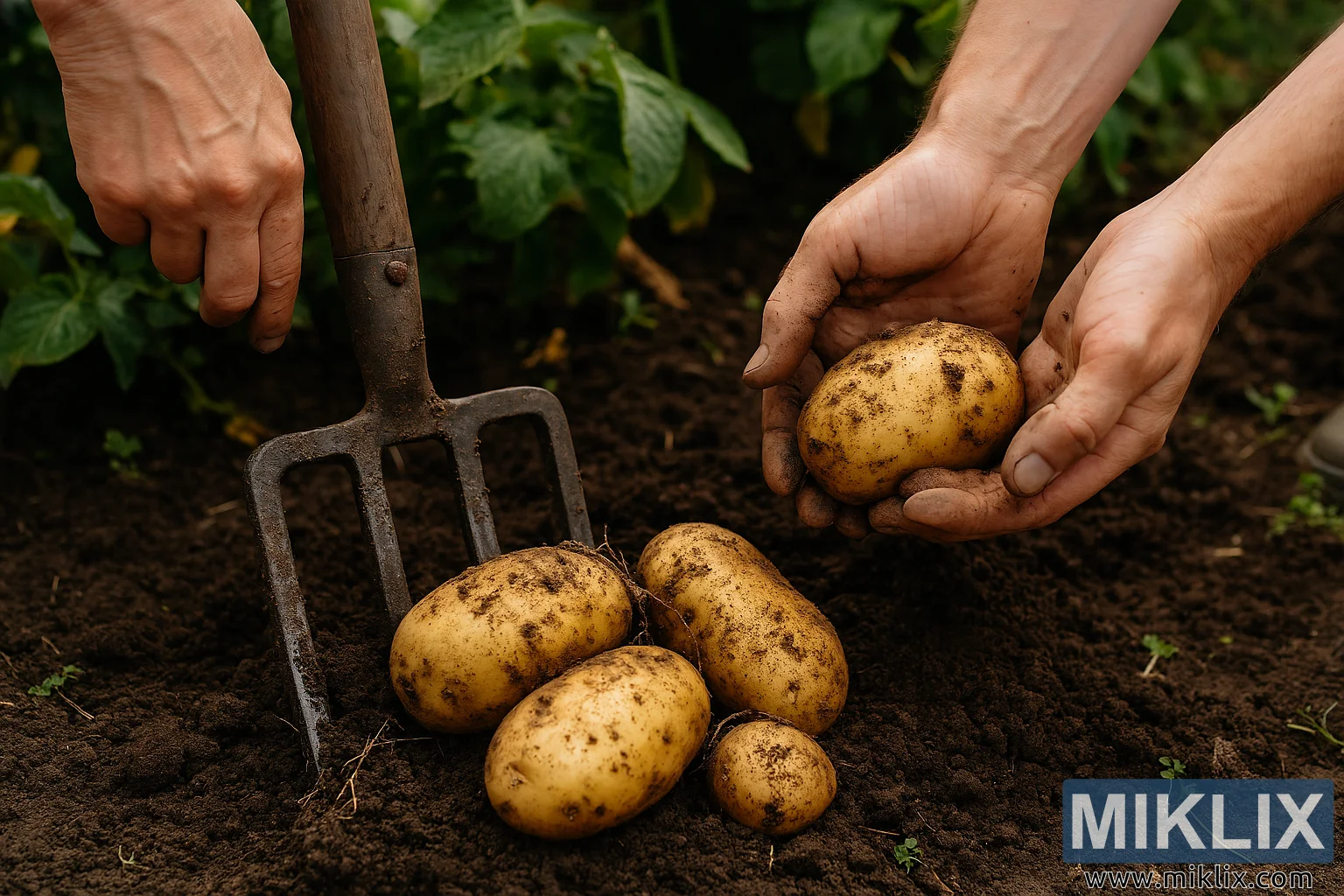 Close-up of hands using a garden fork to harvest mature potatoes from dark soil in a lush garden setting.