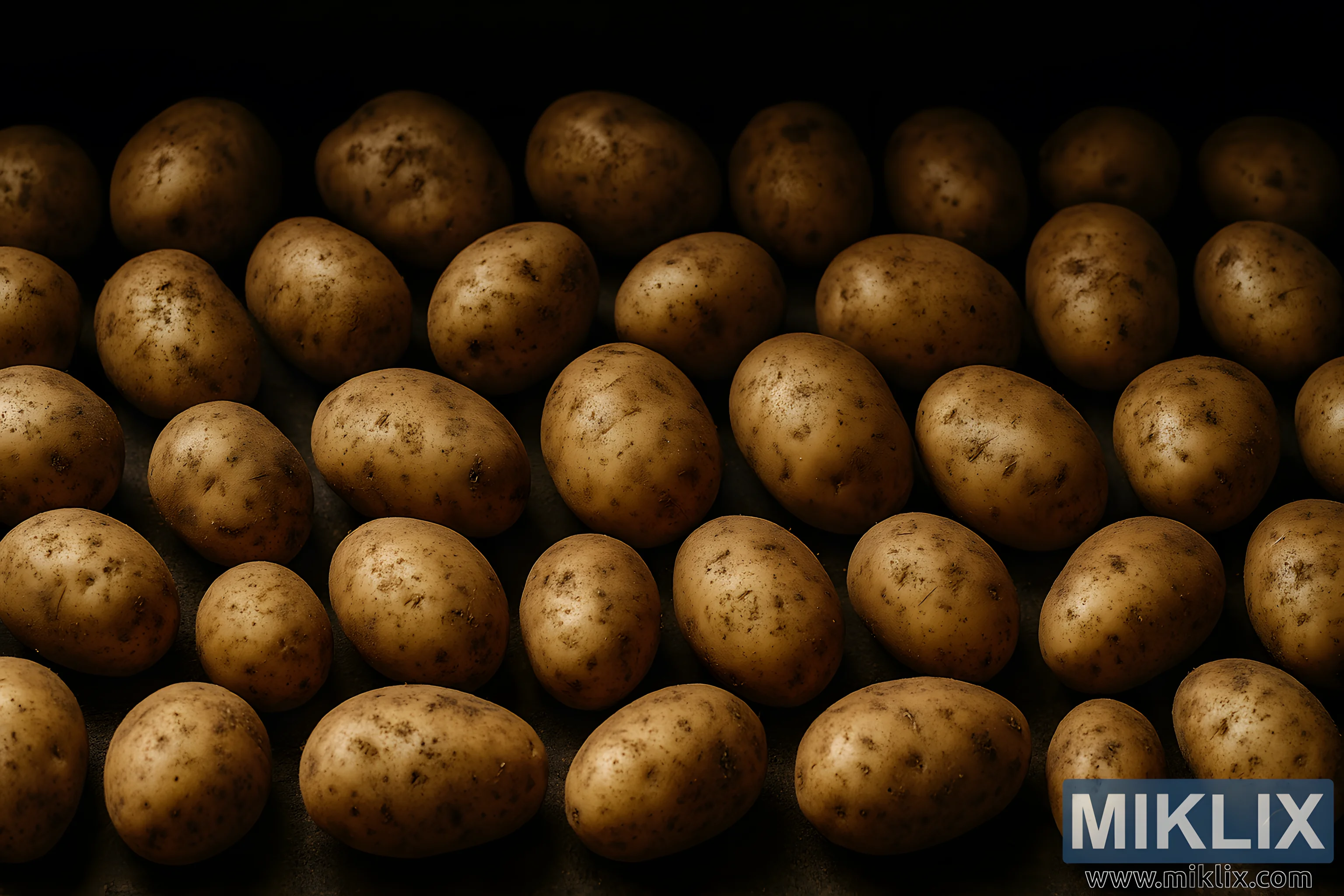 High-resolution image of freshly harvested potatoes arranged in a single layer for curing in a dark, earthy space. Ideal for agricultural, culinary, or educational use.