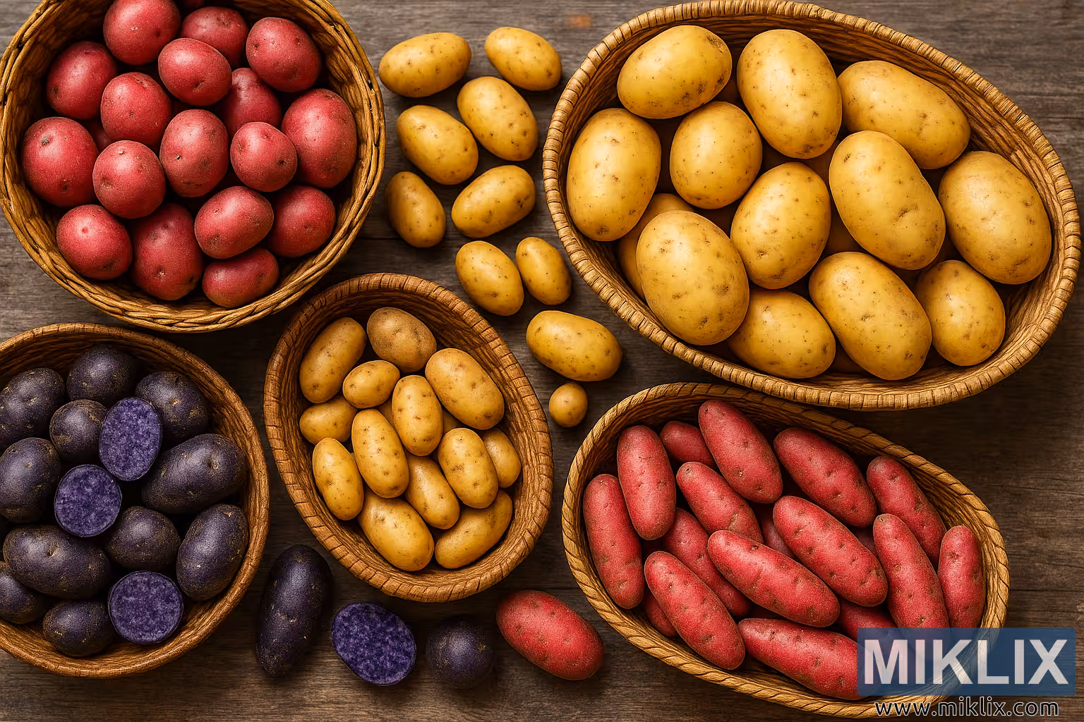 A vibrant harvest of red, yellow, purple, and fingerling potatoes arranged in woven baskets on a rustic wooden surface, showcasing natural textures and earthy tones.