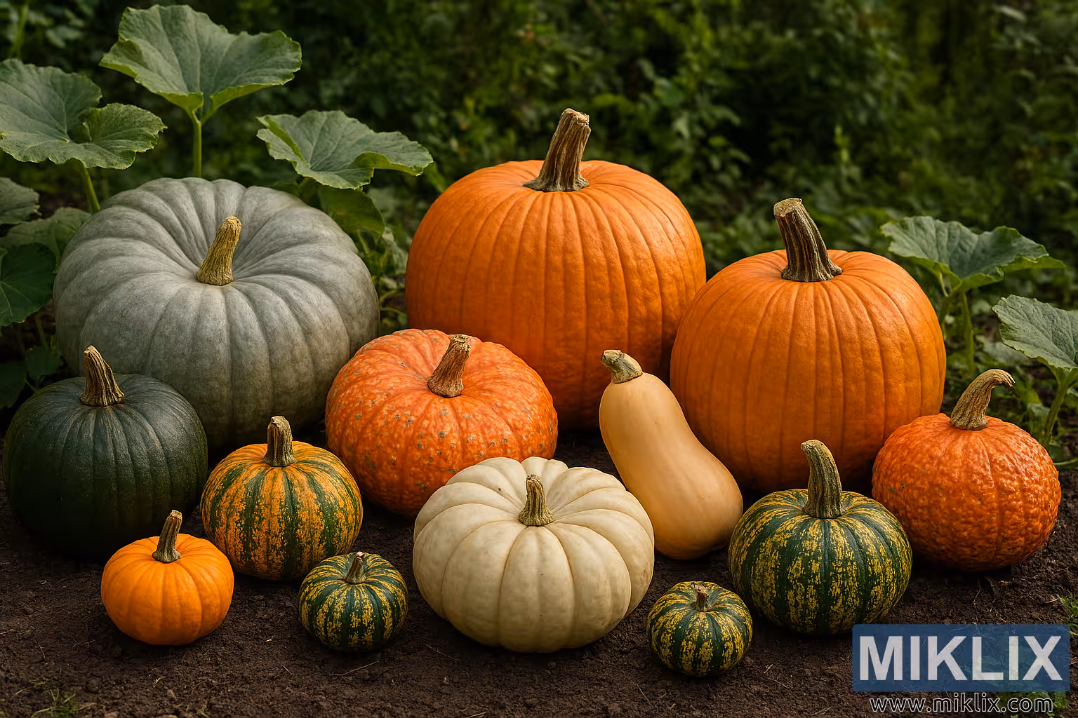 The lighting is soft and natural, casting gentle shadows and enhancing the textures of the pumpkins, squash, and surrounding vegetation. The overall composition is balanced and immersive, ideal for illustrating the range of pumpkin varieties available for cultivation, educational use, or seasonal display.
