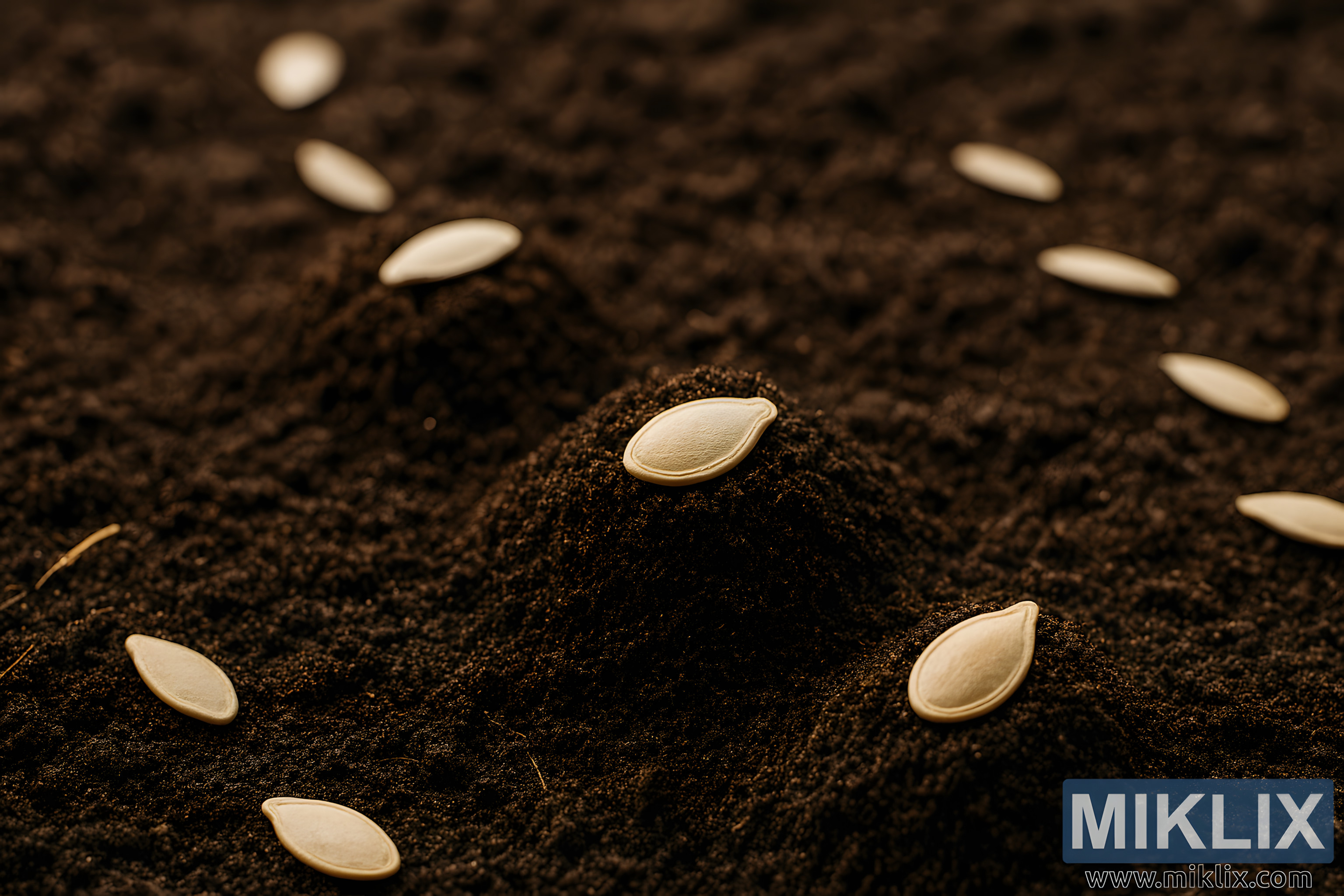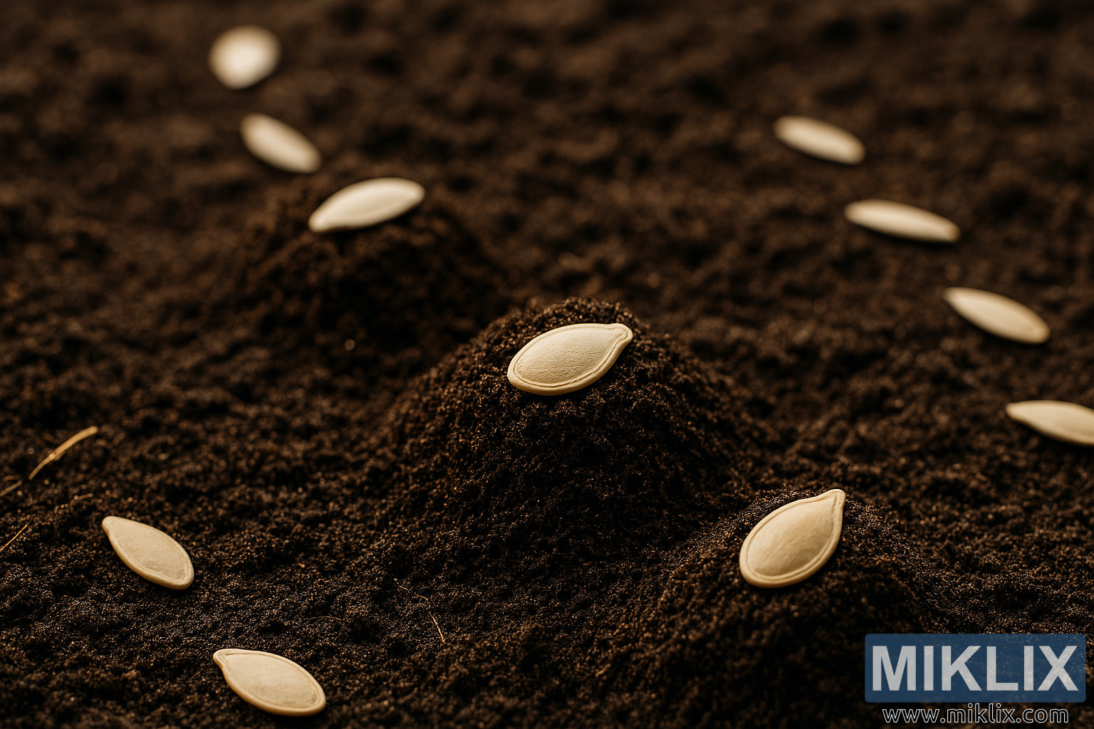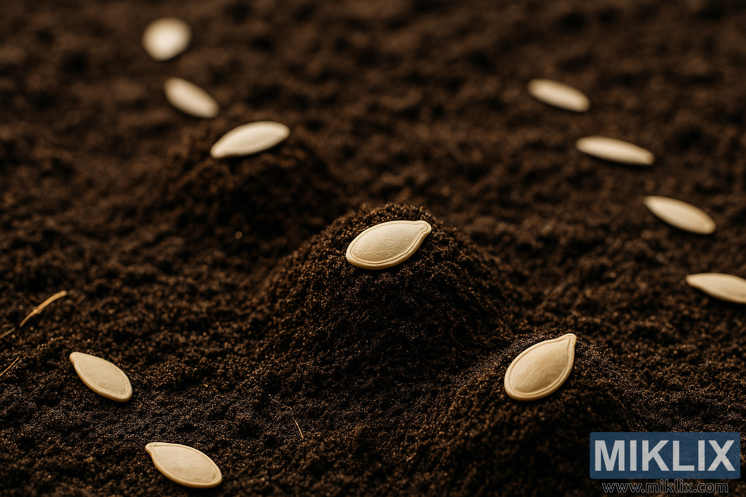 A detailed close-up image of pumpkin seeds being planted in rich soil mounds, capturing the early stages of pumpkin cultivation.