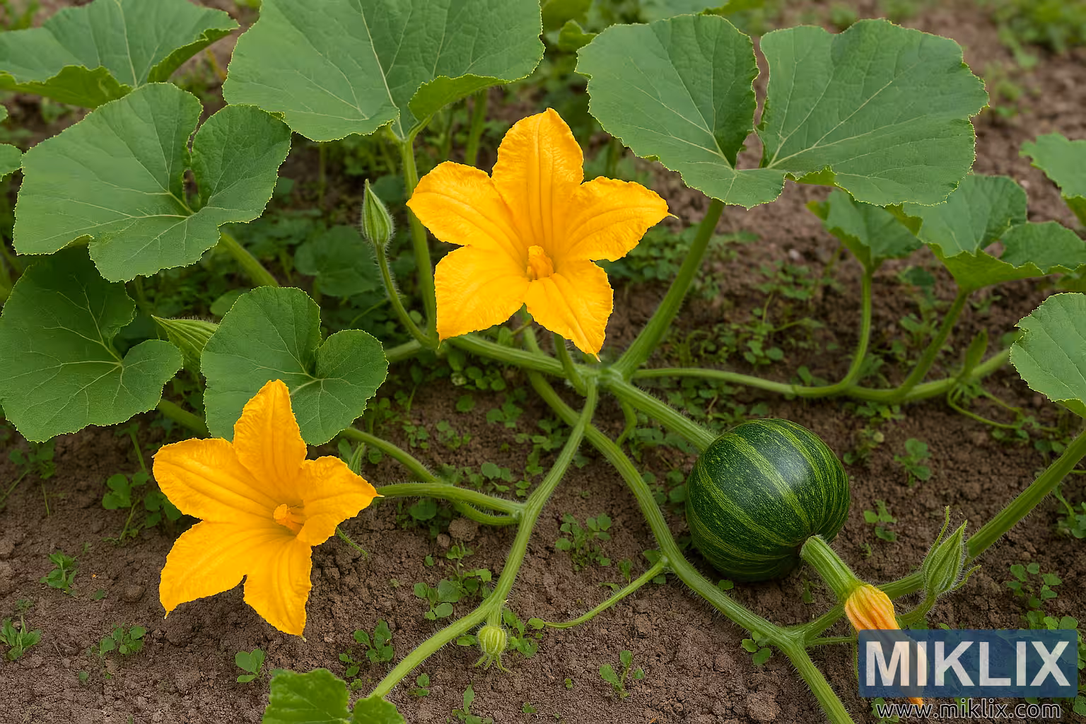 A vibrant pumpkin vine grows in a garden, showcasing lush leaves, bright blossoms, and young fruit.