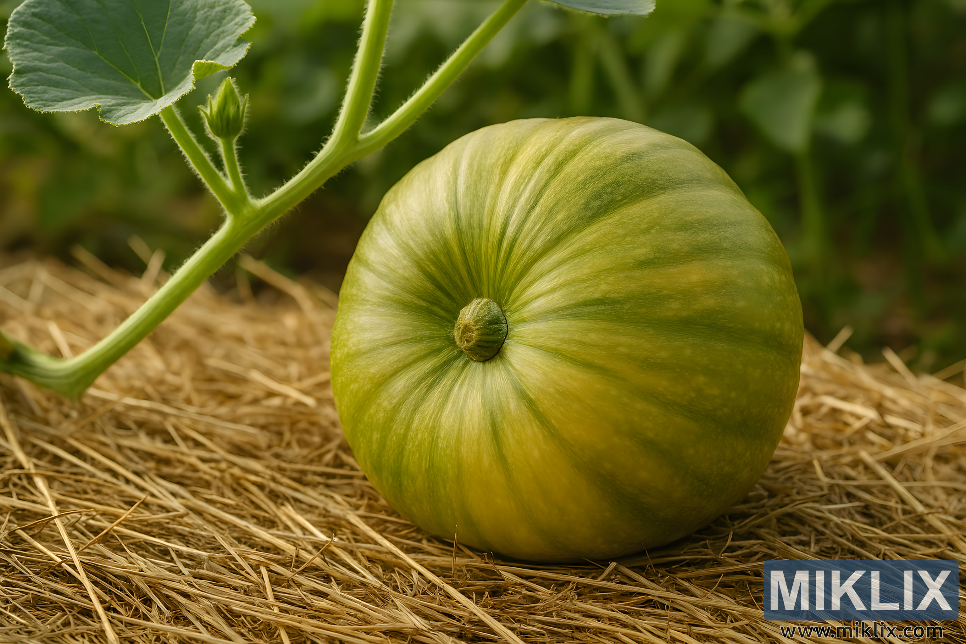 A high-resolution landscape photograph captures a developing pumpkin nestled on a bed of straw in a natural garden setting. The pumpkin is medium-sized, round, and slightly flattened, with a smooth surface that transitions from deep green near the stem to a lighter yellow-green toward the base. Its skin is marked by subtle vertical ribbing, radiating from the short, thick, green stem at the top. The stem is ridged and slightly curved, with a rough texture and a lighter green halo where it meets the pumpkin’s body.