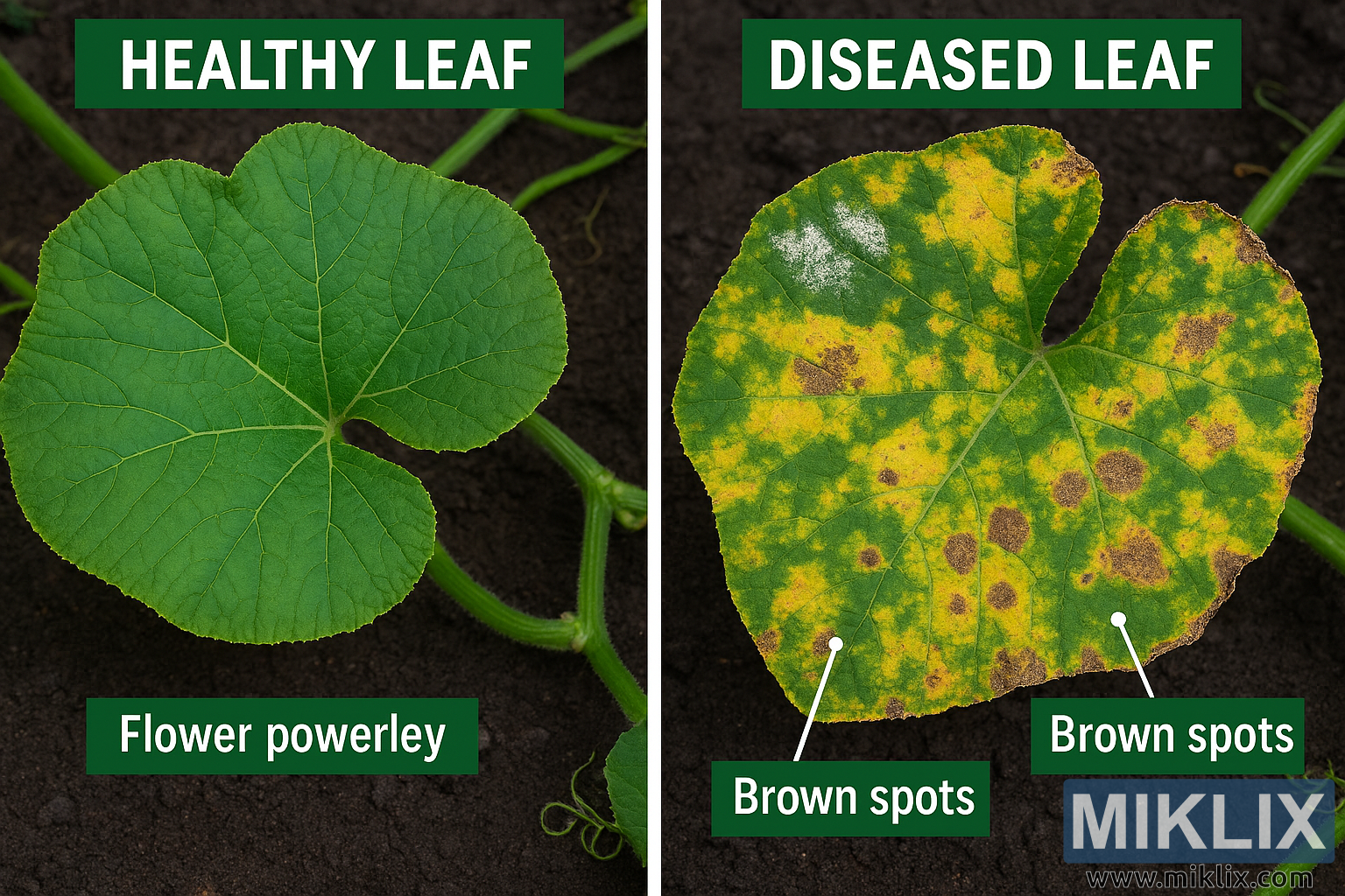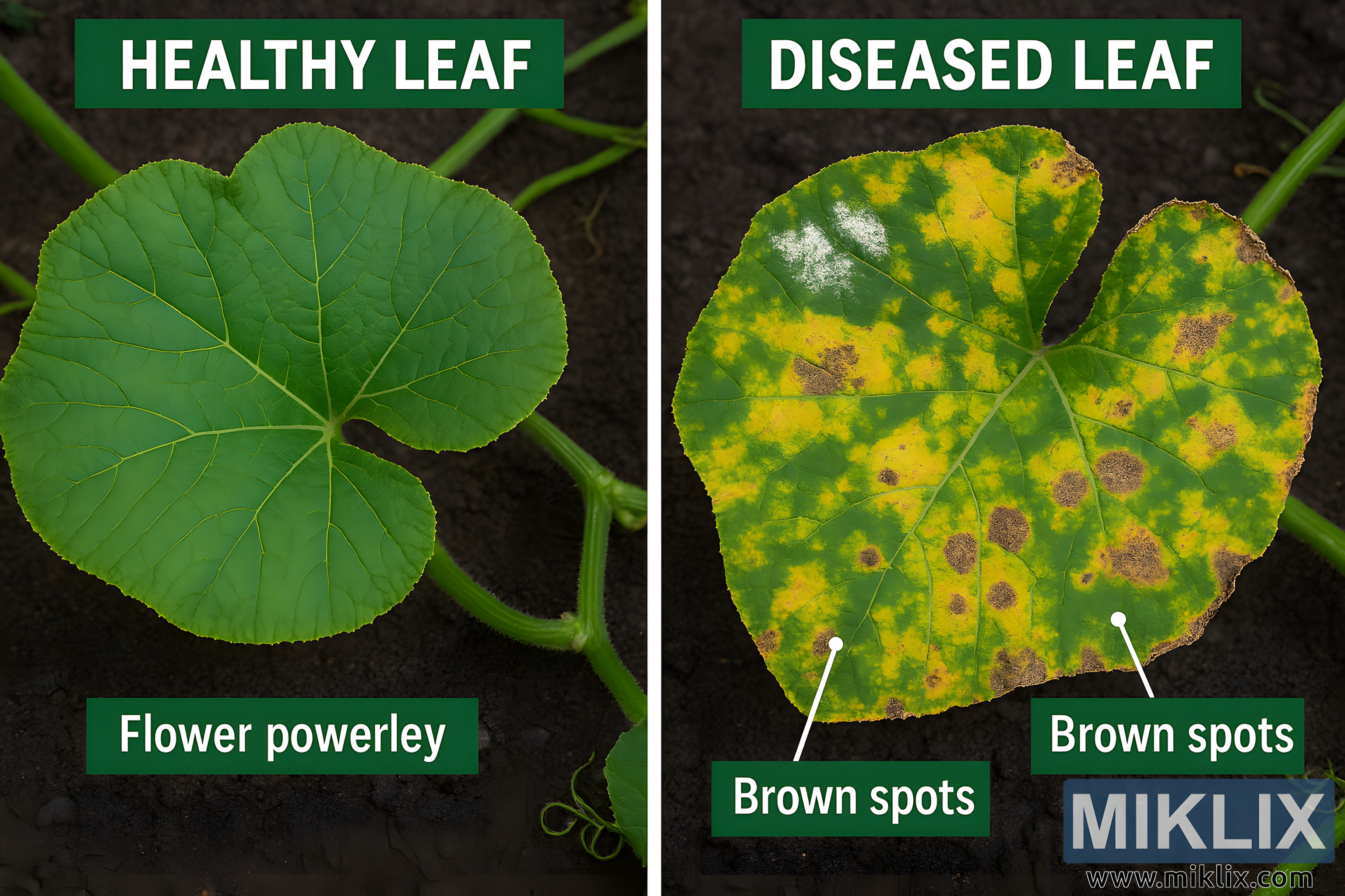 This high-resolution landscape image presents a clear side-by-side comparison of healthy and diseased pumpkin leaves, designed to illustrate common leaf health issues for educational and diagnostic purposes.