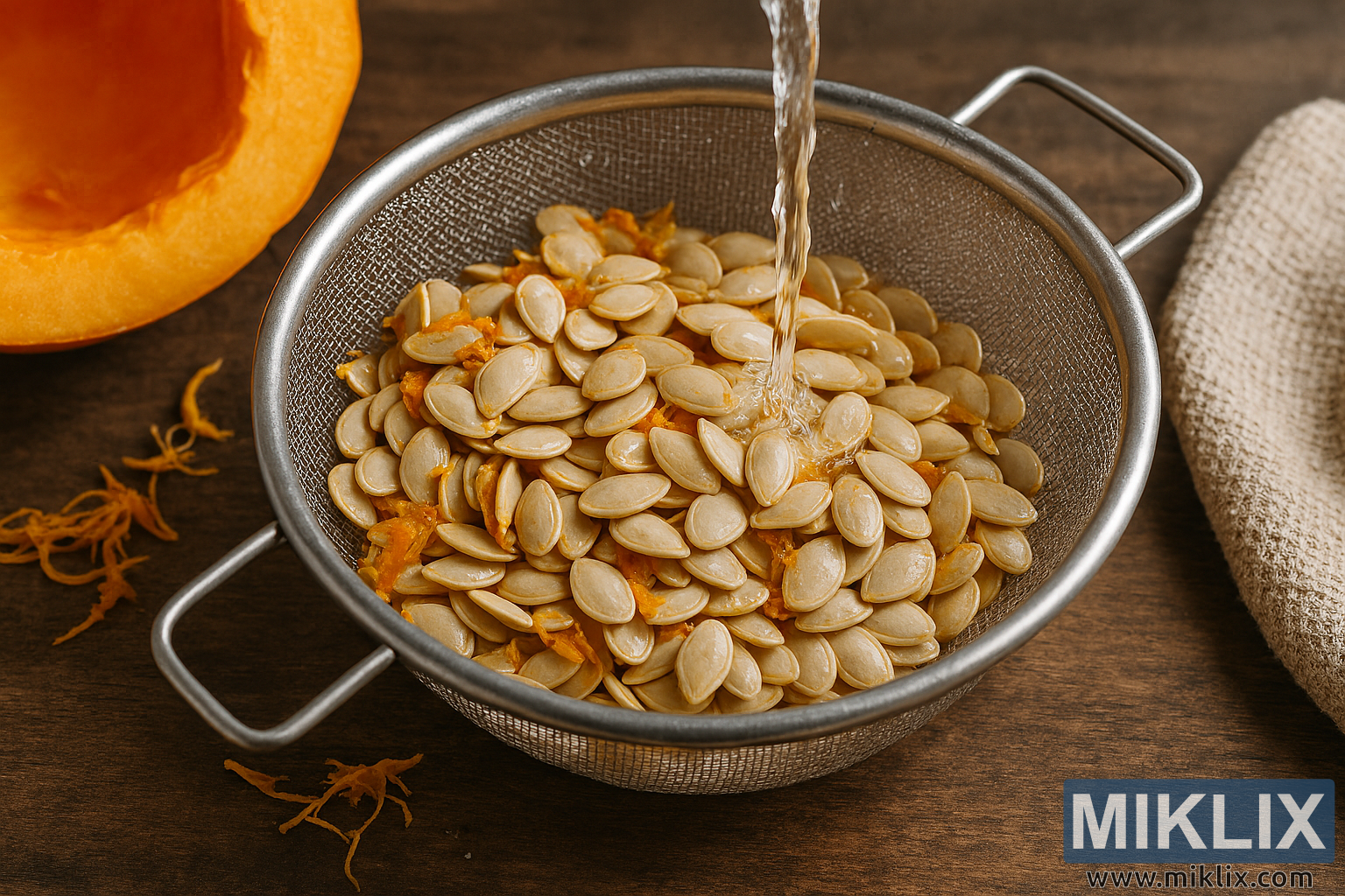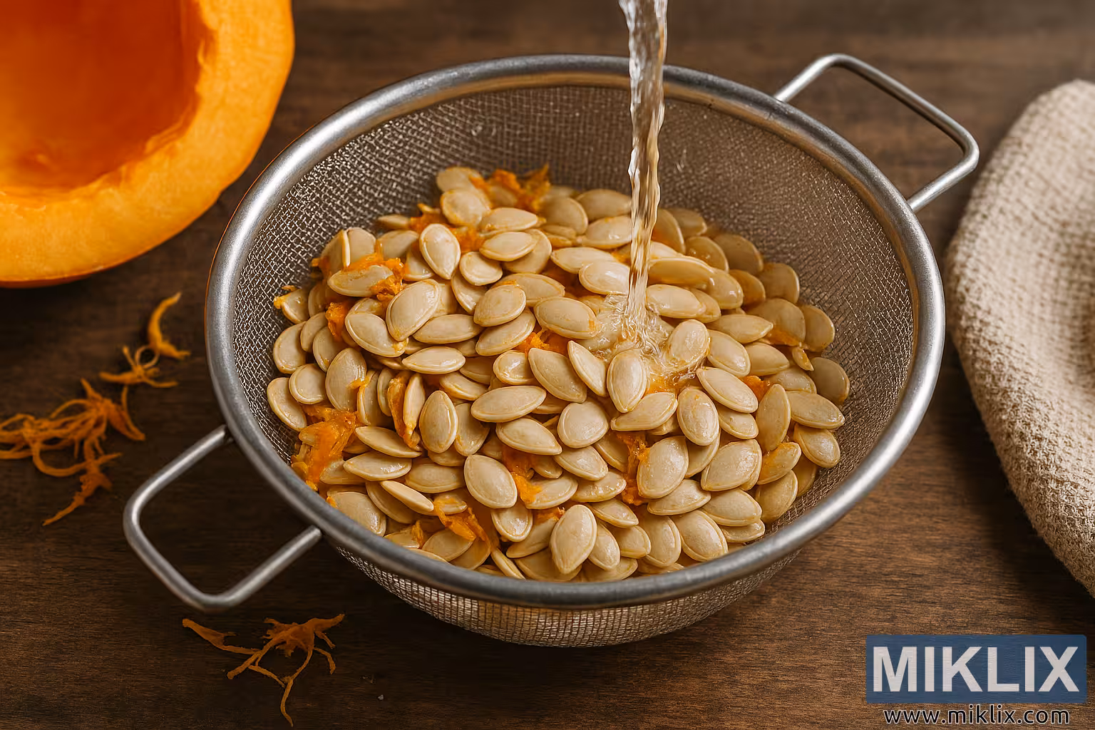 High-resolution image of pumpkin seeds being cleaned and prepared for drying, featuring a rustic kitchen setup with natural lighting and detailed textures.