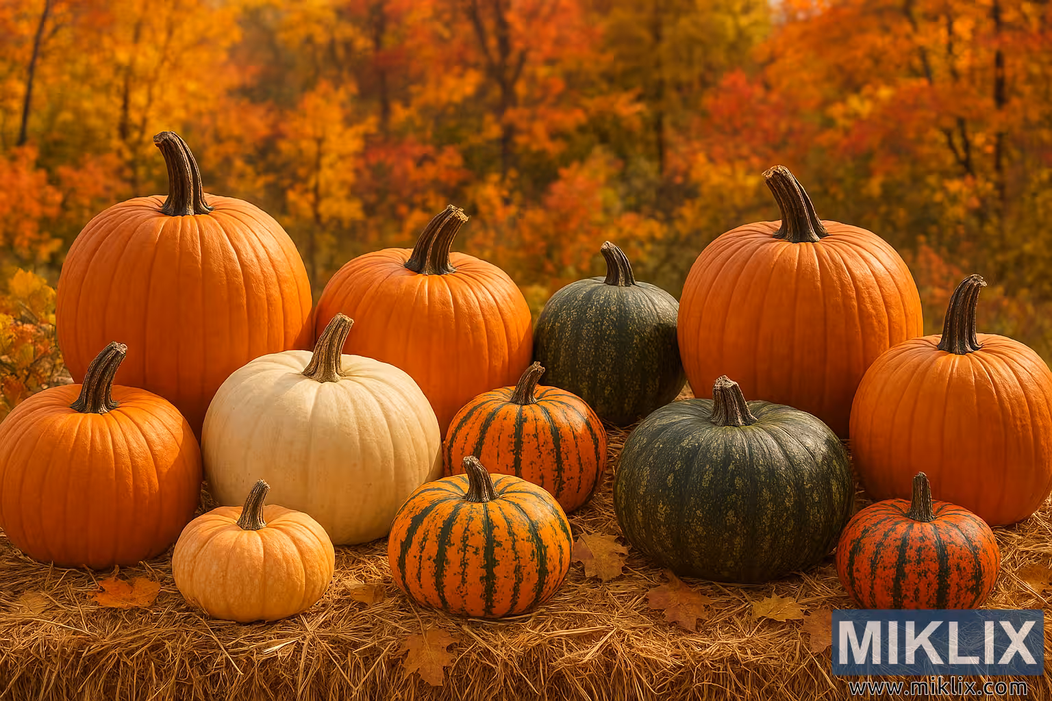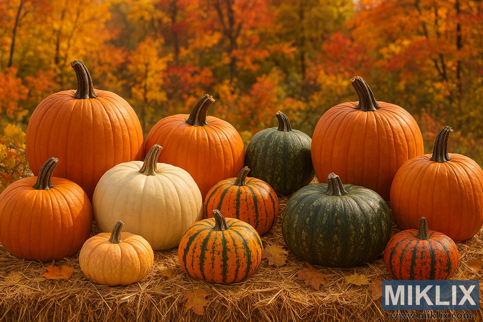 A vibrant autumn scene featuring a diverse display of pumpkins and gourds in a natural outdoor setting, surrounded by colorful fall foliage.