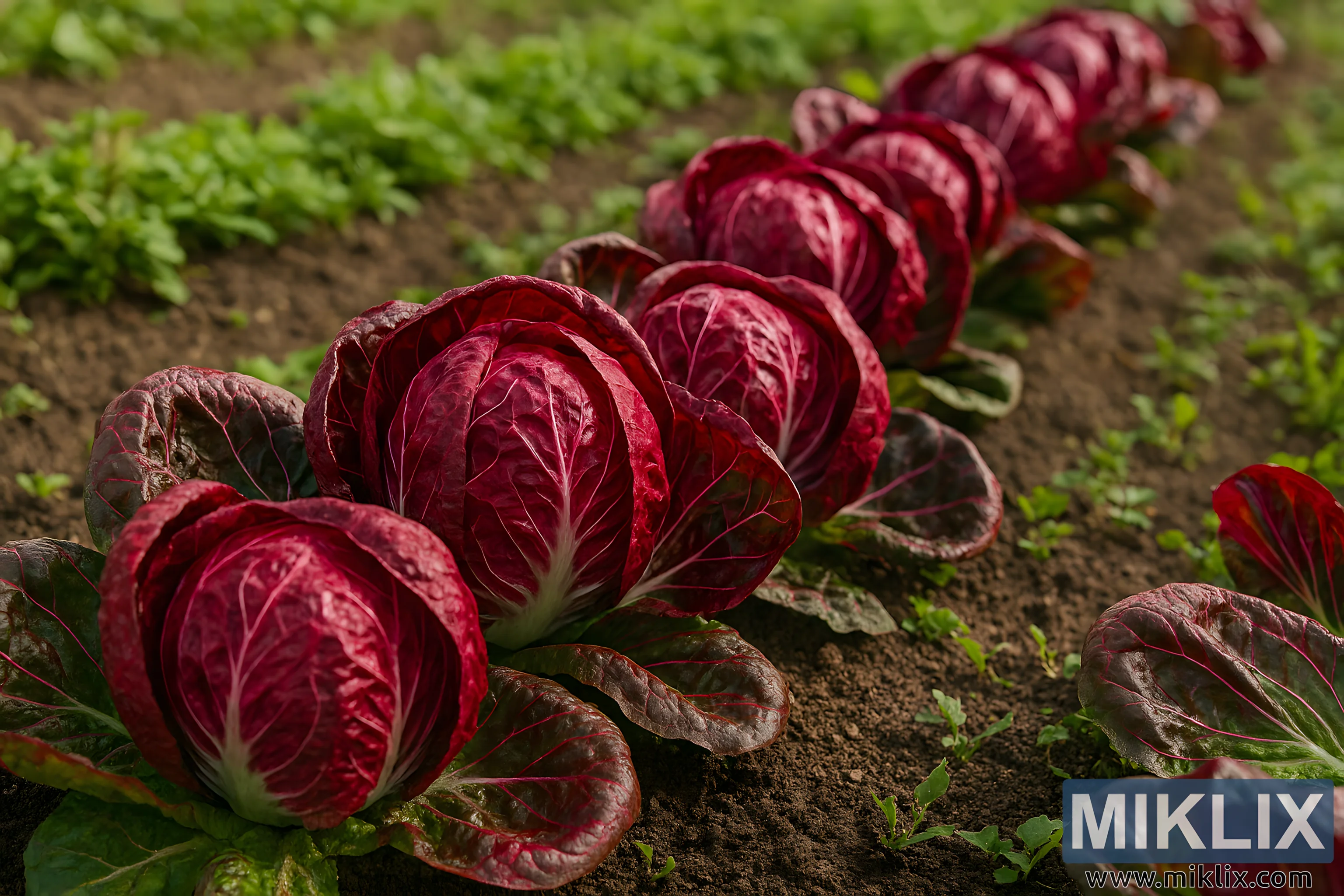 High-resolution image of red radicchio heads in a garden row, showcasing rich color and texture.