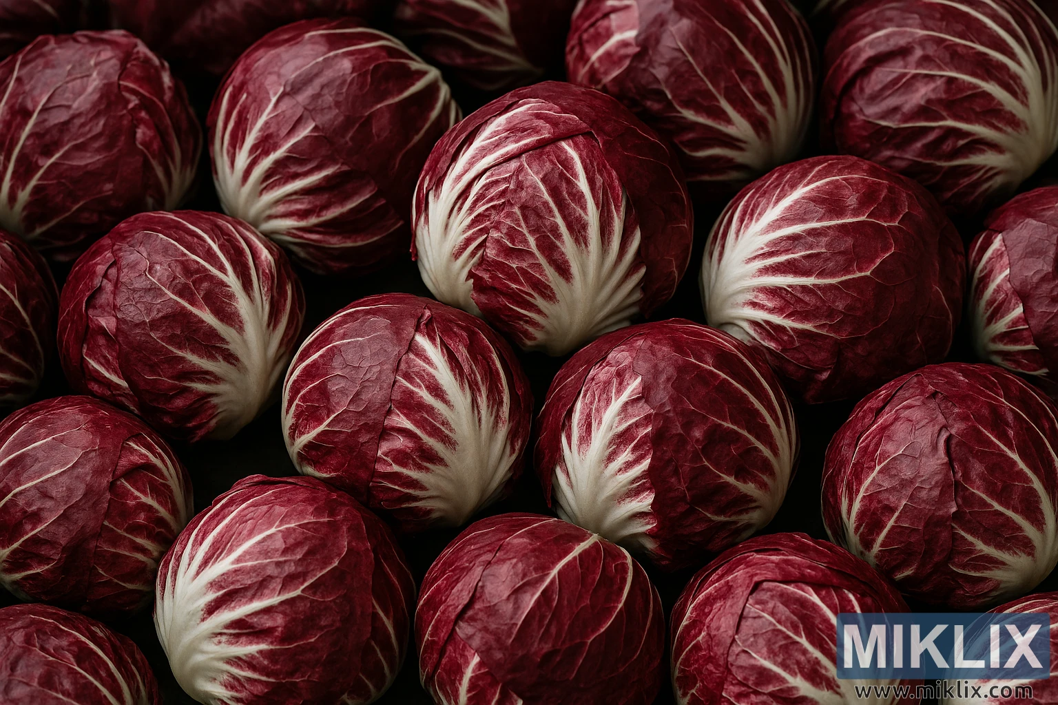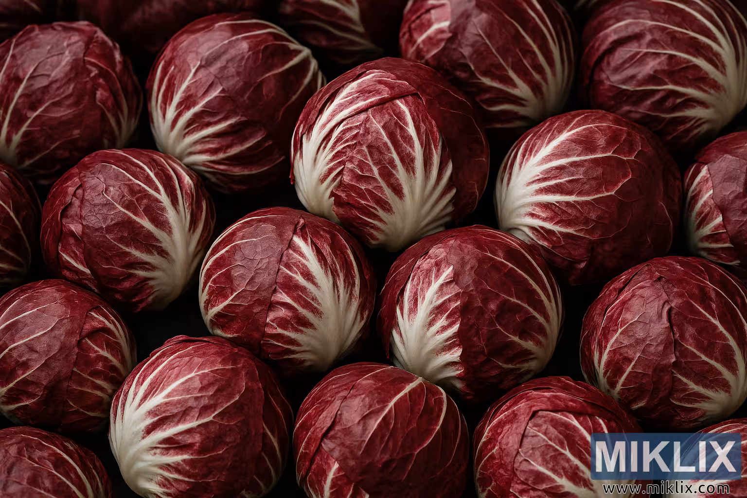 Explore a detailed landscape photo of Radicchio di Chioggia featuring compact, cabbage-like heads with deep red leaves and crisp white veining.