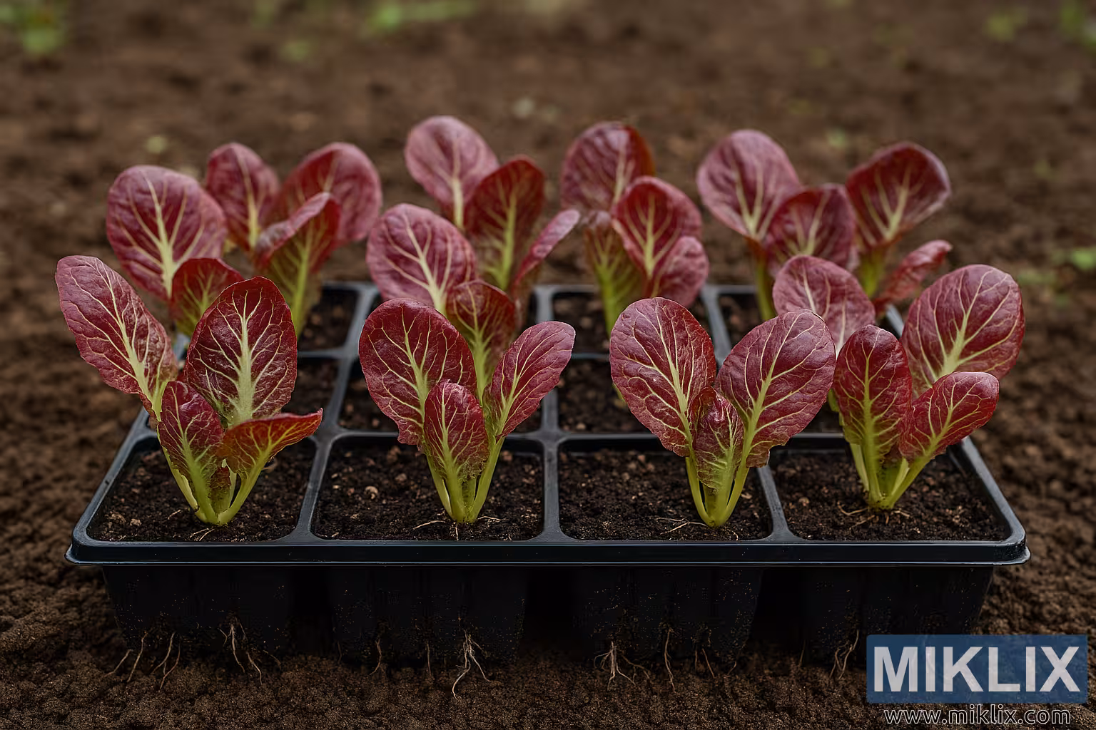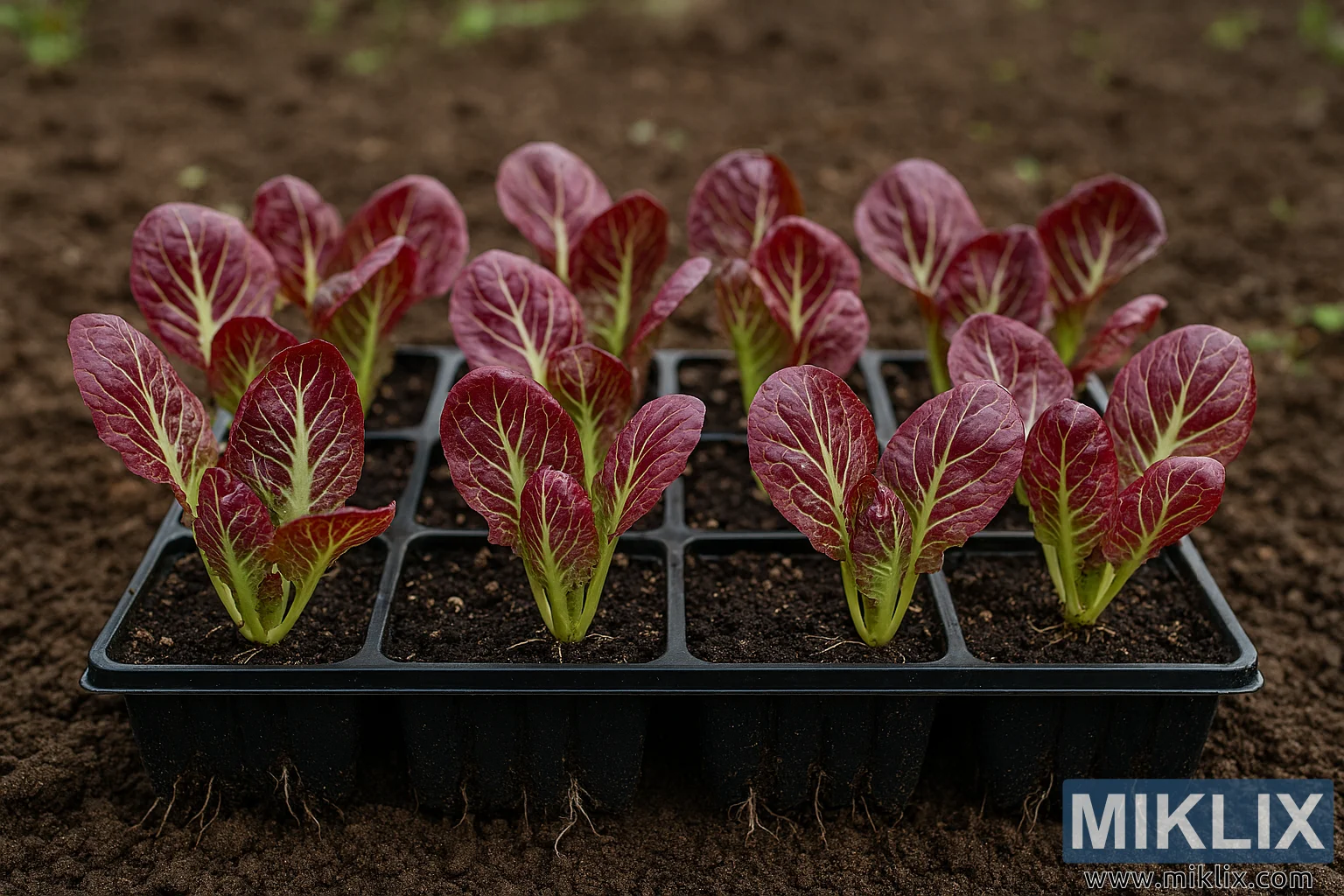 High-resolution landscape photo of radicchio seedlings in black trays on rich garden soil, showing vibrant red-green leaves and transplant-ready roots.