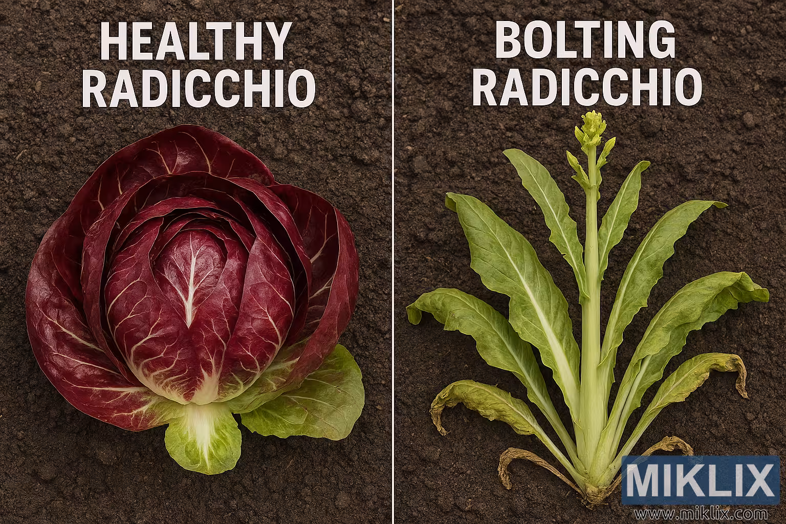 High-resolution landscape image comparing a healthy radicchio head with a bolting radicchio plant, highlighting differences in leaf structure and growth.
