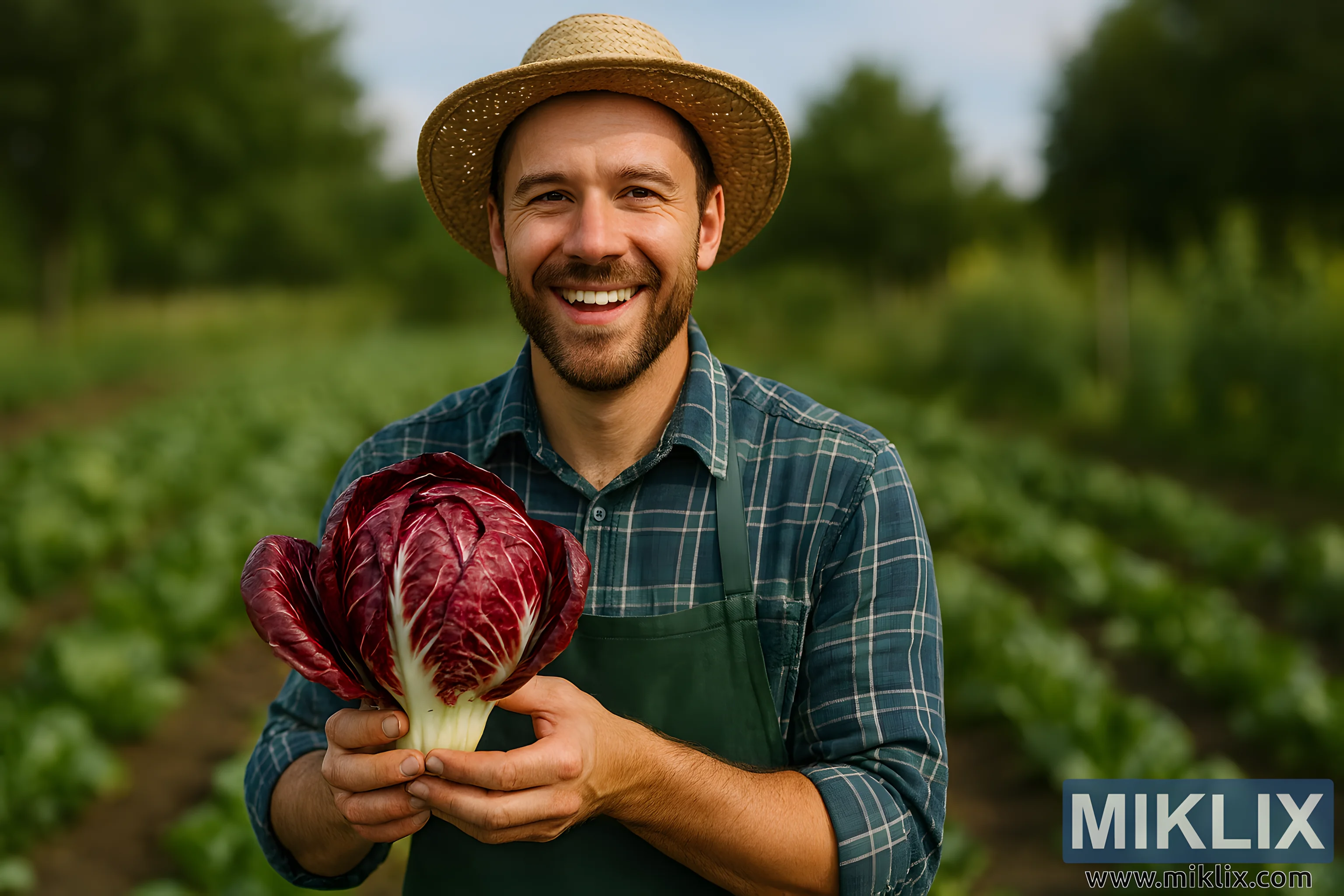 In this high-resolution landscape photograph, a cheerful gardener stands proudly in the midst of a thriving vegetable garden, holding a freshly harvested head of radicchio. The gardener is a Caucasian male in his mid-30s, with light skin, a neatly trimmed beard, and short brown hair peeking out from under a straw hat. His broad smile and slightly squinting eyes convey genuine happiness and satisfaction. Crow’s feet at the corners of his eyes and flushed cheeks add to the warmth of his expression.