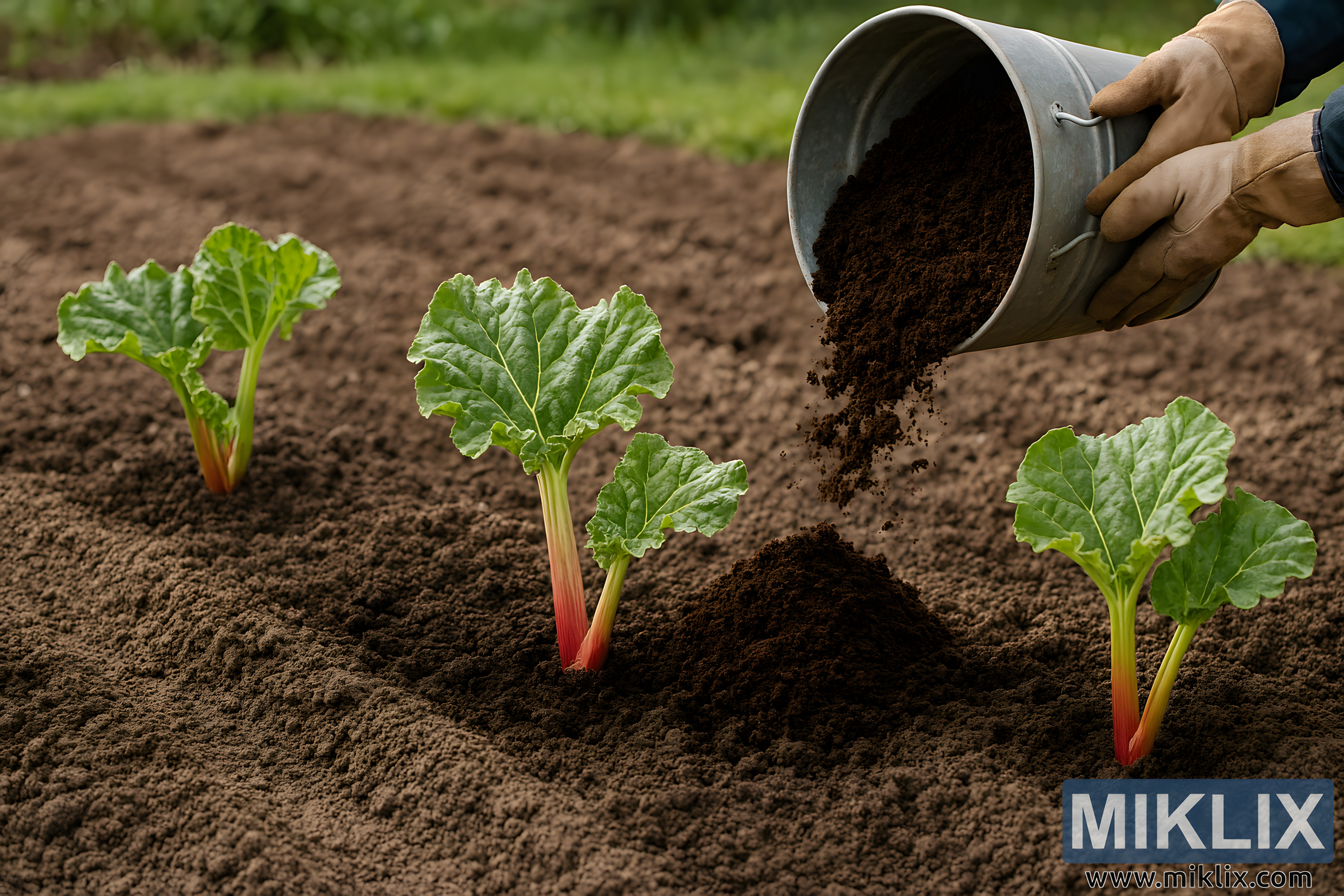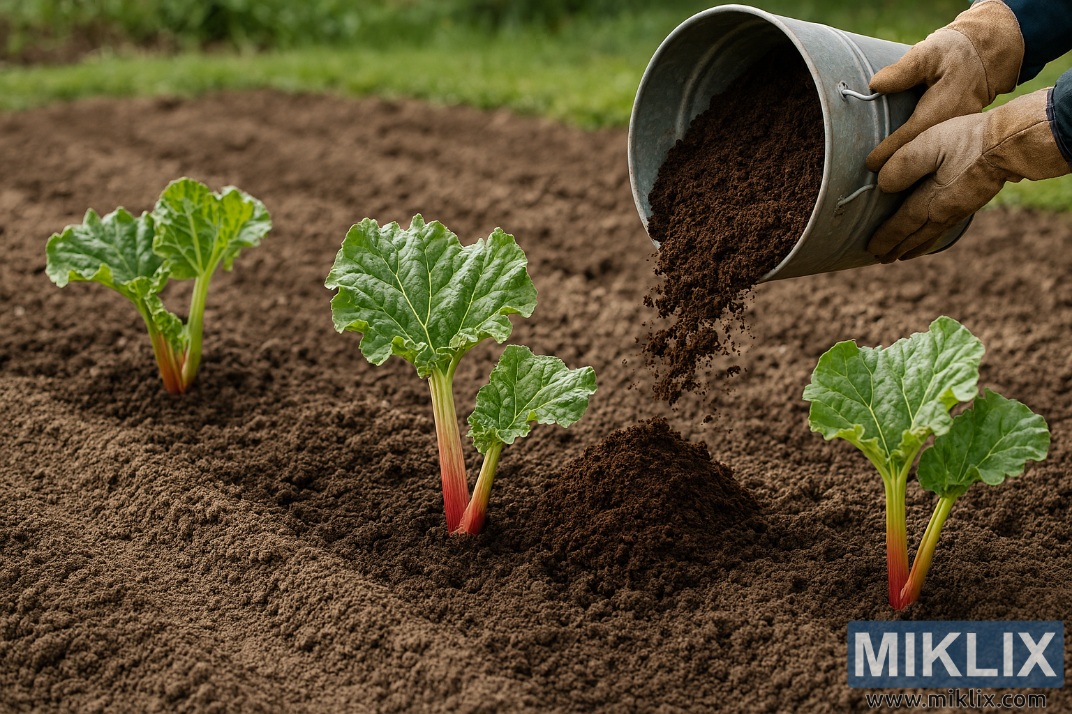 The composition is balanced and purposeful, highlighting the interaction between human care and plant cultivation. The earthy tones of the soil and compost contrast beautifully with the vivid greens and reds of the rhubarb, while the gardener’s gloved hands introduce a sense of action and stewardship. This image conveys a narrative of preparation, growth, and sustainable gardening practices, ideal for educational, catalog, or promotional use in horticultural contexts.