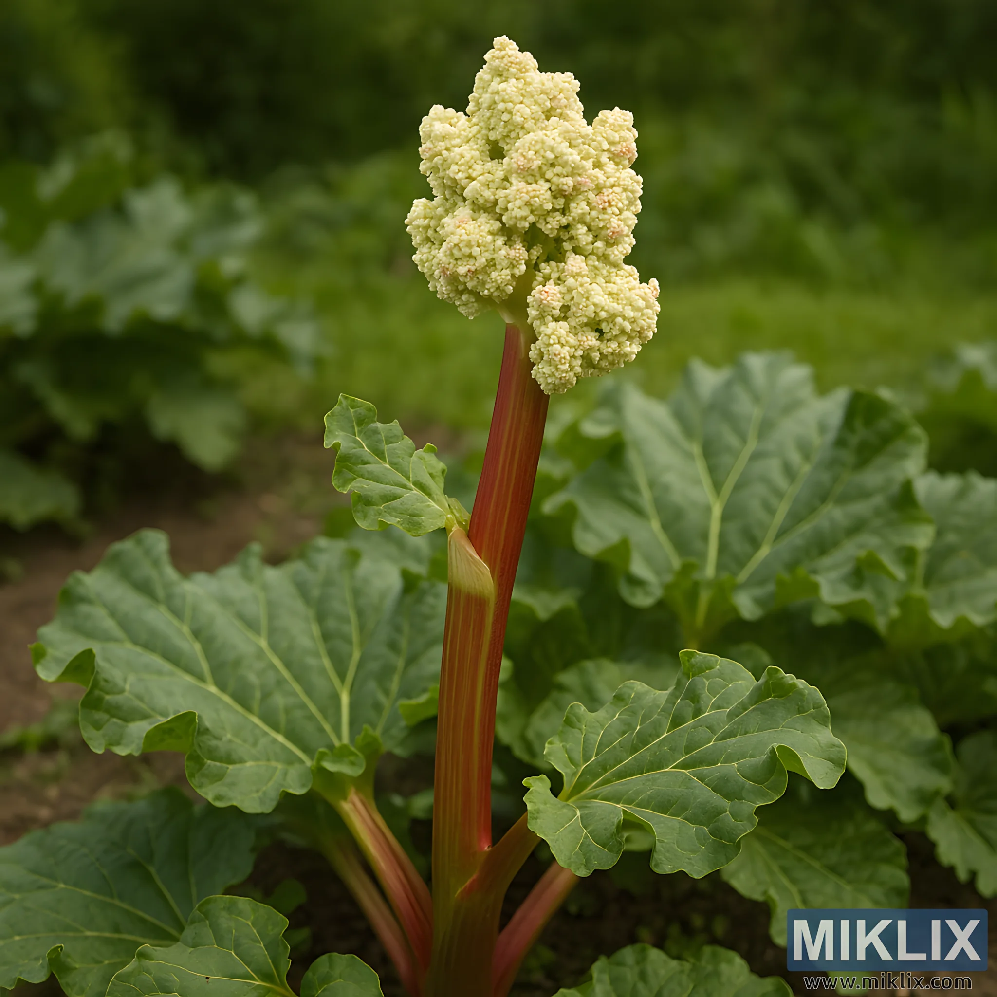 Overall, the composition is both informative and visually appealing, combining botanical accuracy with aesthetic clarity. The image is ideal for gardening guides, educational materials, and plant identification resources, emphasizing the importance of recognizing and managing rhubarb flower stalks.