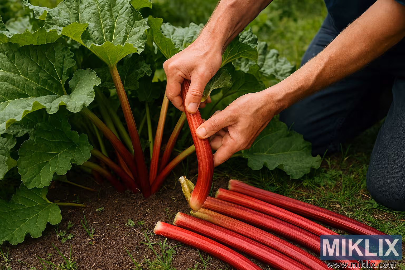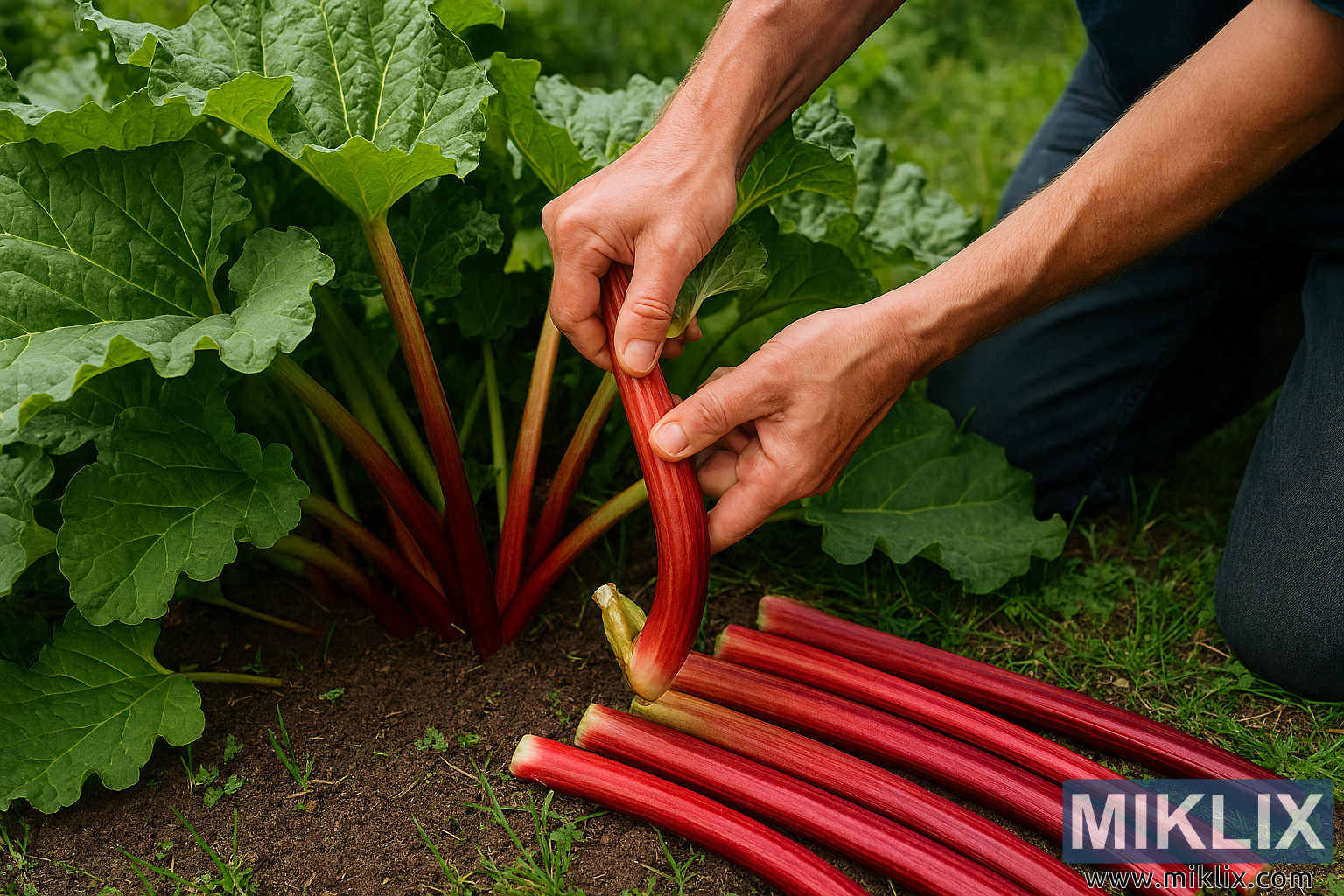 Close-up of hands harvesting rhubarb stalks using a twisting motion in a lush garden setting. Shows technique and fresh produce.