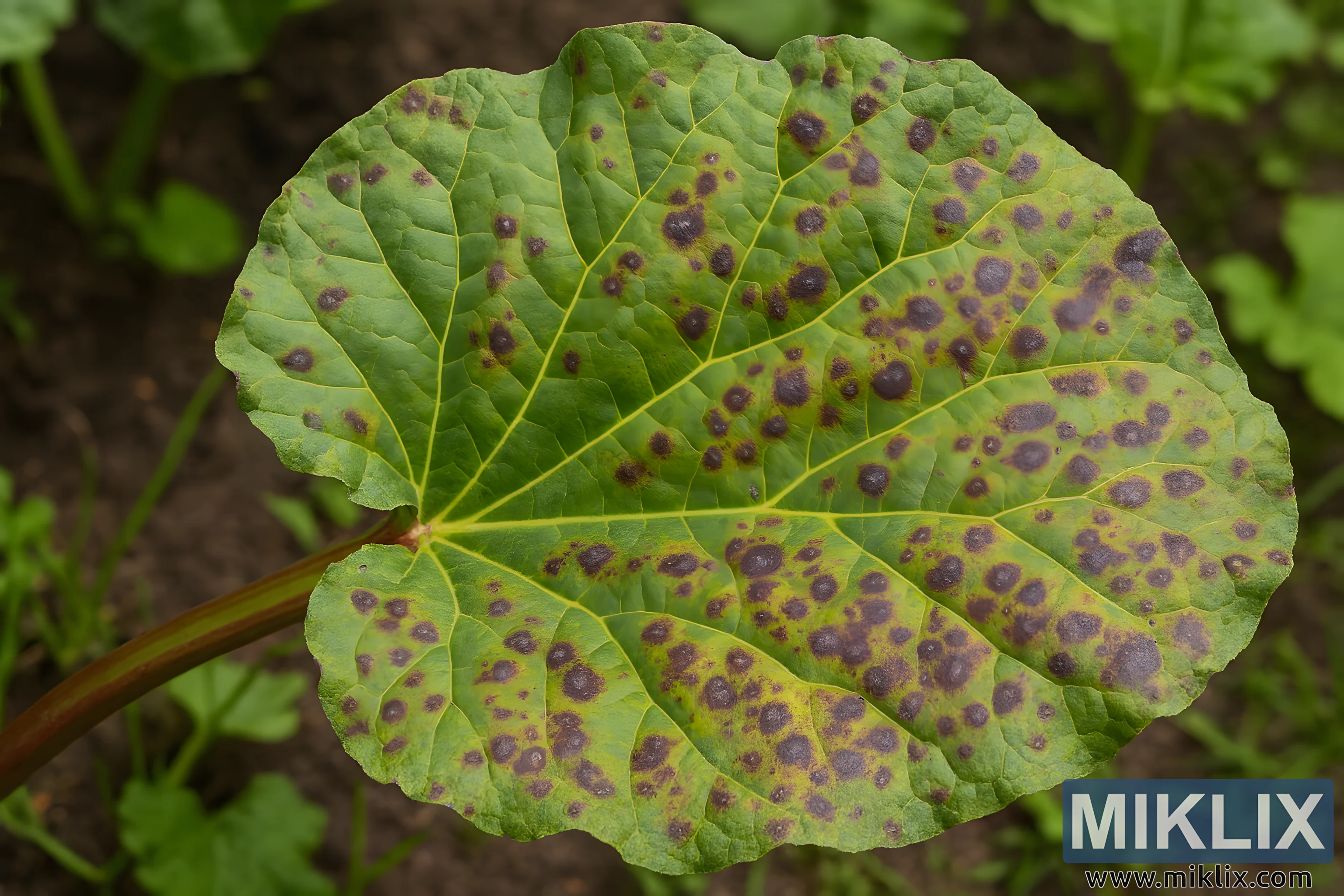 High-resolution image of a rhubarb leaf affected by leaf spot disease, showing dark lesions and chlorosis.