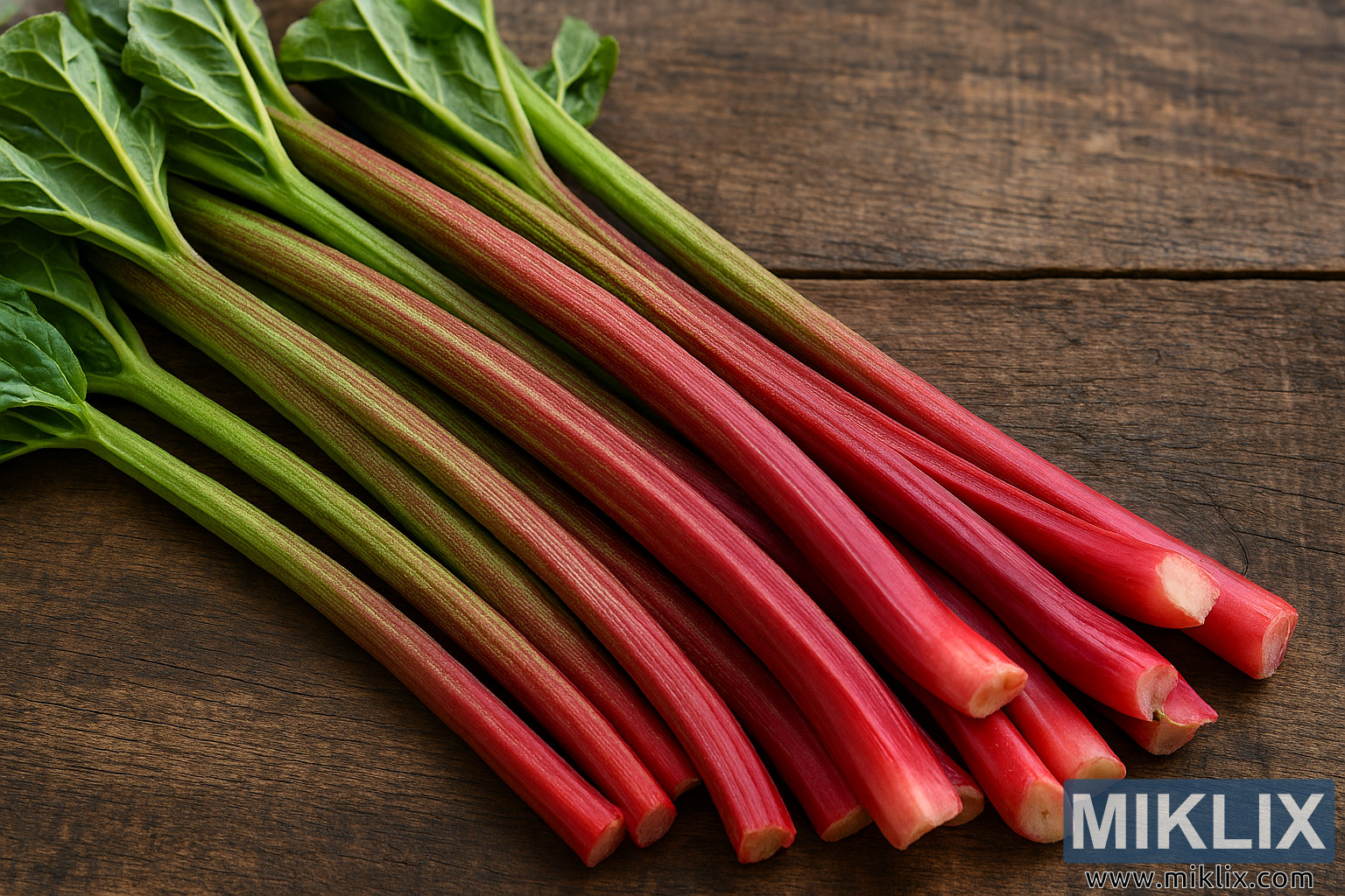 Image: Freshly Harvested Rhubarb Stalks on Rustic Wood