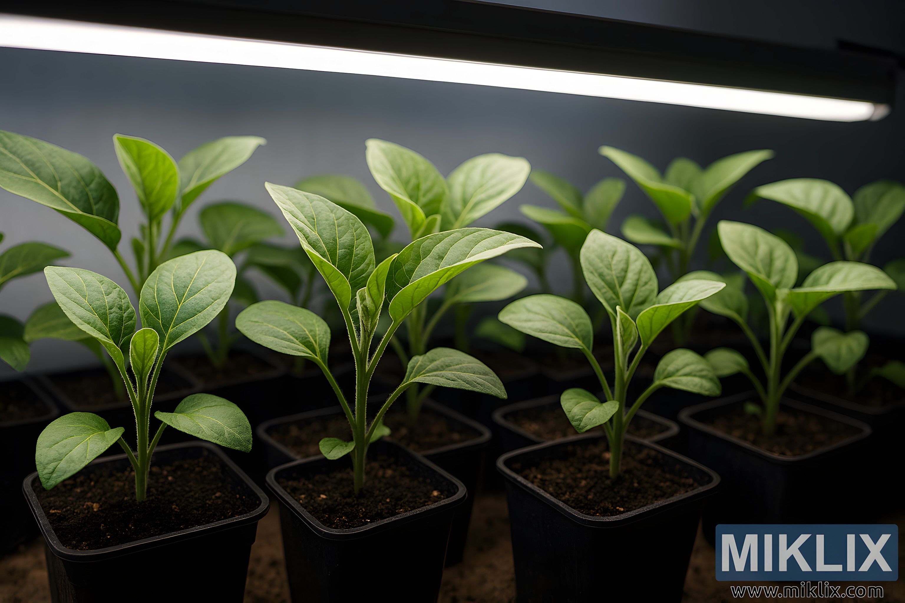Above the seedlings, a sleek LED grow light fixture spans the width of the frame. Encased in a slim, white housing, the fixture emits a bright, cool white light that bathes the plants evenly. The light enhances the natural green tones of the leaves and casts soft, diffuse shadows on the soil and pot surfaces, emphasizing the depth and dimensionality of the scene.
