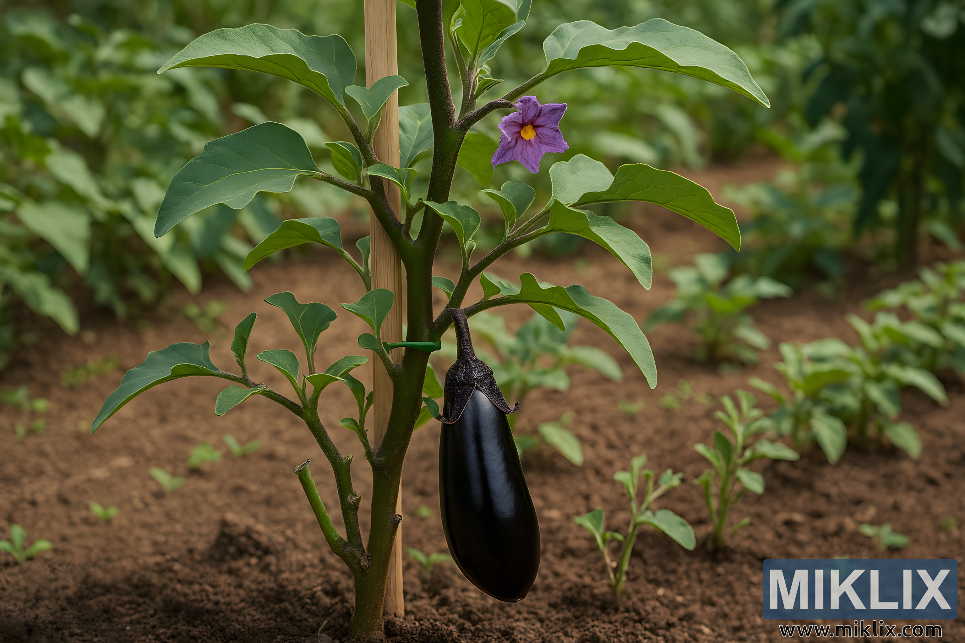 High-resolution image of a properly staked and pruned eggplant plant in a garden, showcasing healthy growth and vibrant fruit.