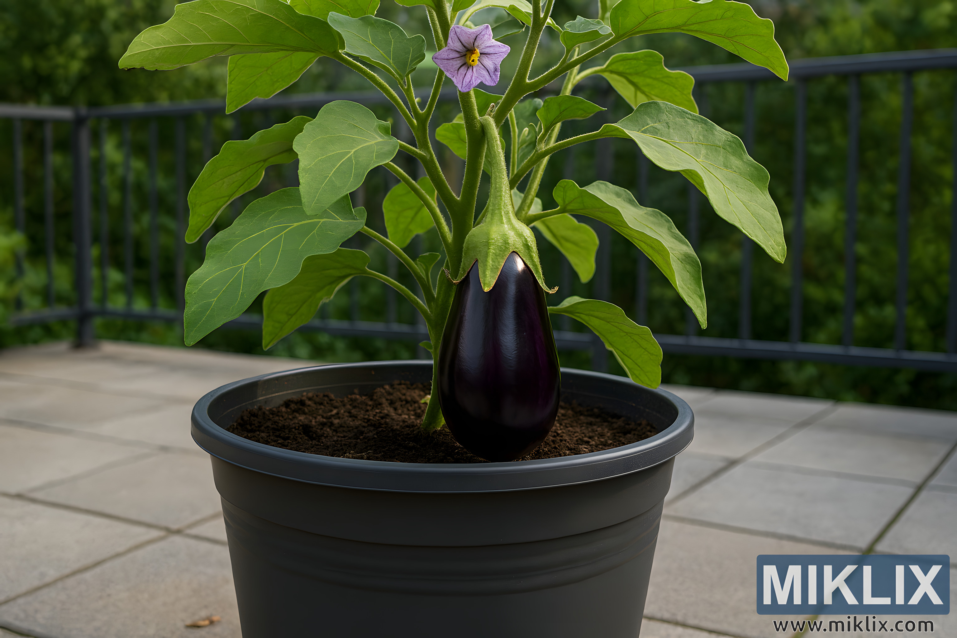 A vibrant eggplant plant flourishes in a spacious container on a sunlit patio, showcasing healthy leaves and glossy purple fruit.