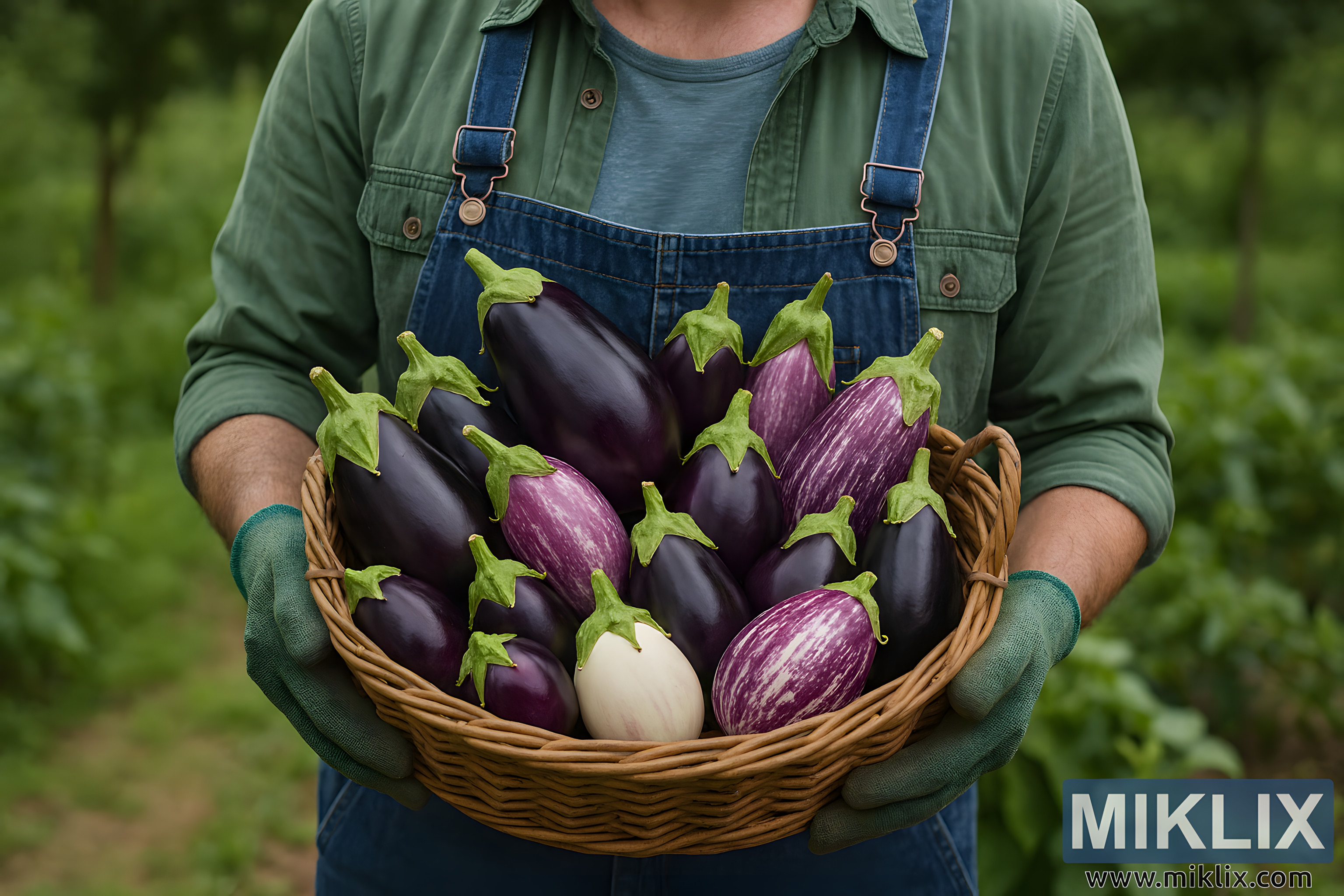 A gardener stands in a lush garden holding a basket filled with freshly picked eggplants of various varieties, showcasing a vibrant harvest and natural textures.