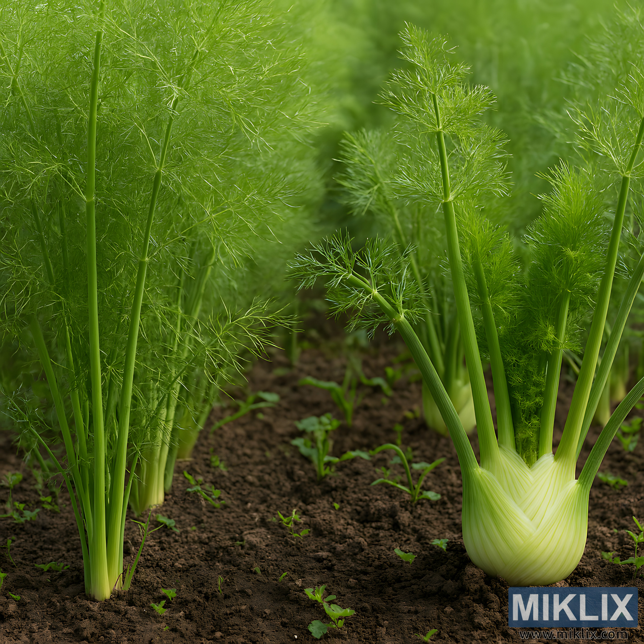 High-resolution landscape photo of herb fennel and Florence fennel growing in a garden, showing feathery foliage and bulbous bases in rich soil.
