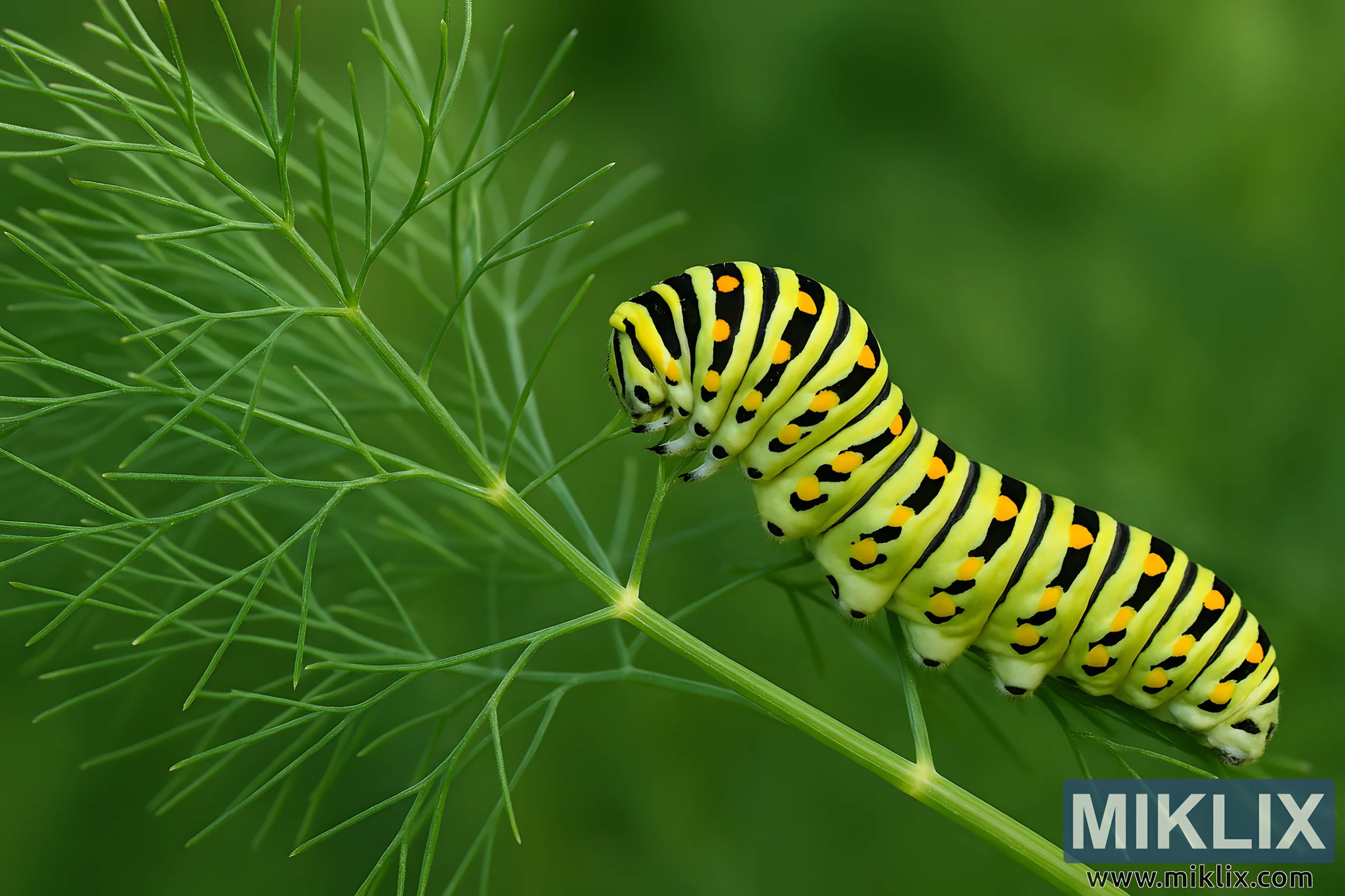 The background is softly blurred, composed of layered green hues that suggest a lush garden setting. This bokeh effect isolates the caterpillar and fennel, drawing the viewer’s attention to their intricate forms. Diagonal lines formed by the fennel stems guide the eye from the lower left corner toward the caterpillar, enhancing the image’s compositional flow.